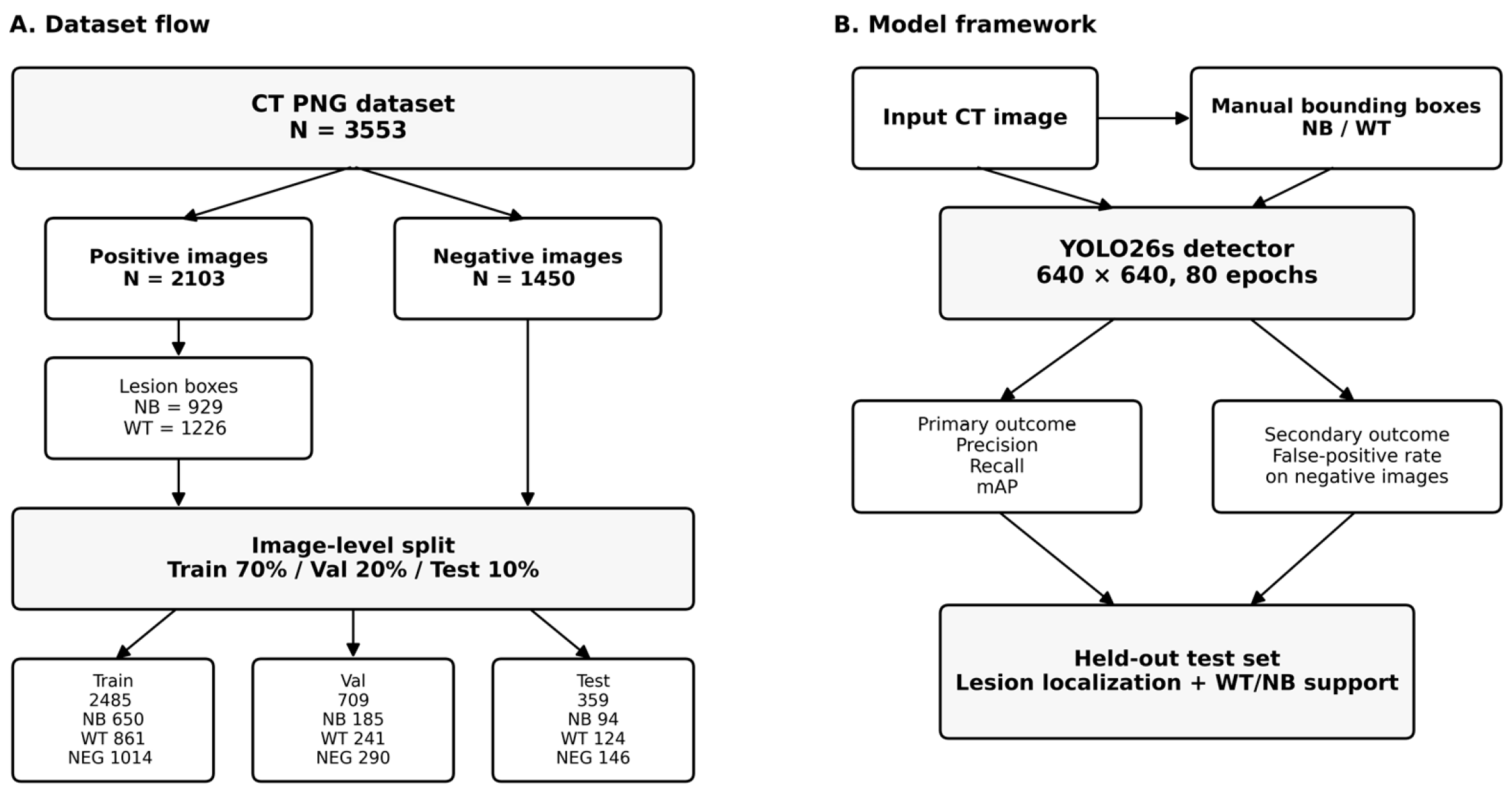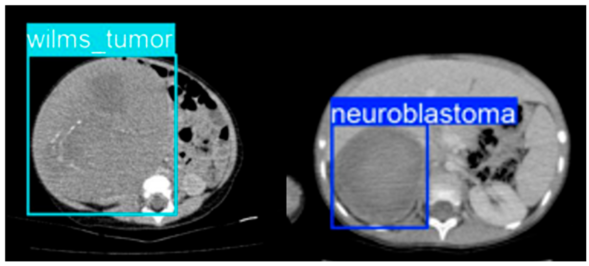 Two target lesion classes were defined for model development: neuroblastoma and Wilms tumor. In the raw dataset structure these classes were originally labeled as nonwt and wt, respectively; for the purposes of the present study and manuscript, they were recoded conceptually as neuroblastoma and Wilms tumor. Background-negative images were not modeled as a third detection class. Instead, they were preserved with empty label files, consistent with standard object-detection practice in which the detector learns both to localize target objects and to suppress detections in images lacking target lesions.