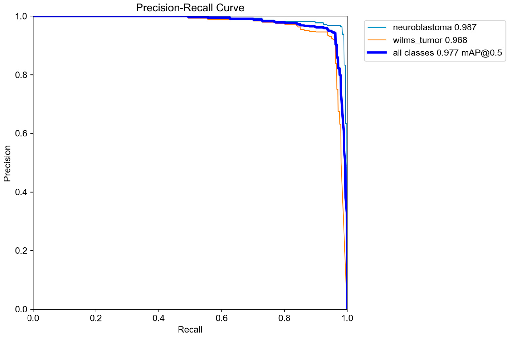 The primary endpoint was lesion-level detection and class-specific discrimination between Wilms tumor and neuroblastoma on the held-out test set. The principal performance metrics were precision, recall, mean average precision at an intersection-over-union threshold of 0.50 (mAP@0.5), and mean average precision averaged across intersection-over-union thresholds from 0.50 to 0.95 in 0.05 increments (mAP@0.5:0.95), as implemented in the Ultralytics validation pipeline. Precision was defined as the number of true-positive detections divided by the sum of true-positive and false-positive detections, whereas recall was defined as the number of true-positive detections divided by the sum of true-positive and false-negative detections. mAP@0.5:0.95 corresponded to the COCO-style averaged detection metric rather than a single-threshold Pascal VOC-style summary.