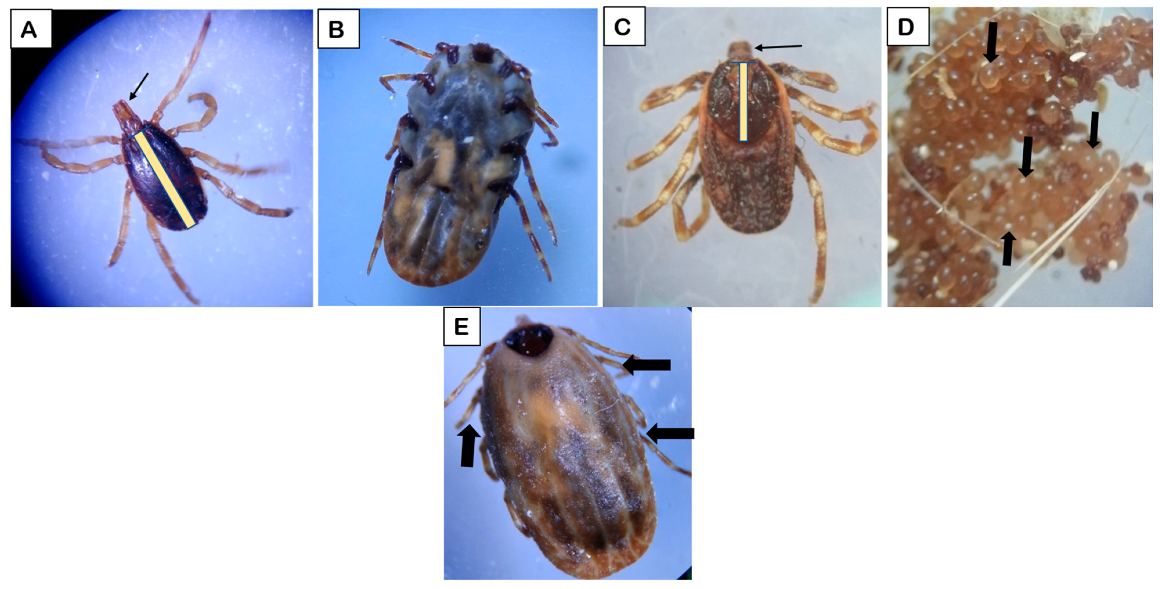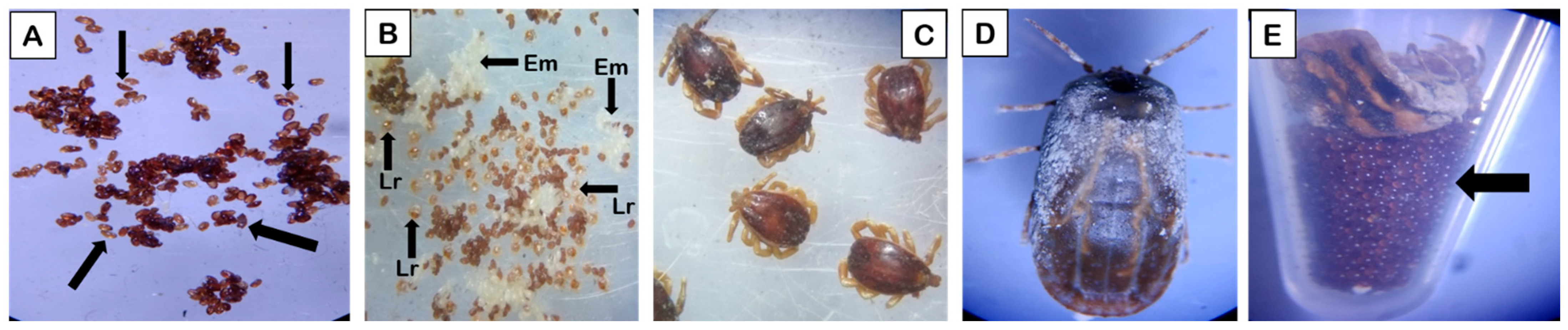 - Zaheer, T.; Kandeel, M.; Abbas, R.Z.; Khan, S.R.; Rehman, T.u.; Aqib, A.I. Acaricidal Potential and Ecotoxicity of Metallic Nano-Pesticides Used against the Major Life Stages of Hyalomma Ticks. Life 2022, 12, 977. [Google Scholar] [CrossRef] [PubMed]