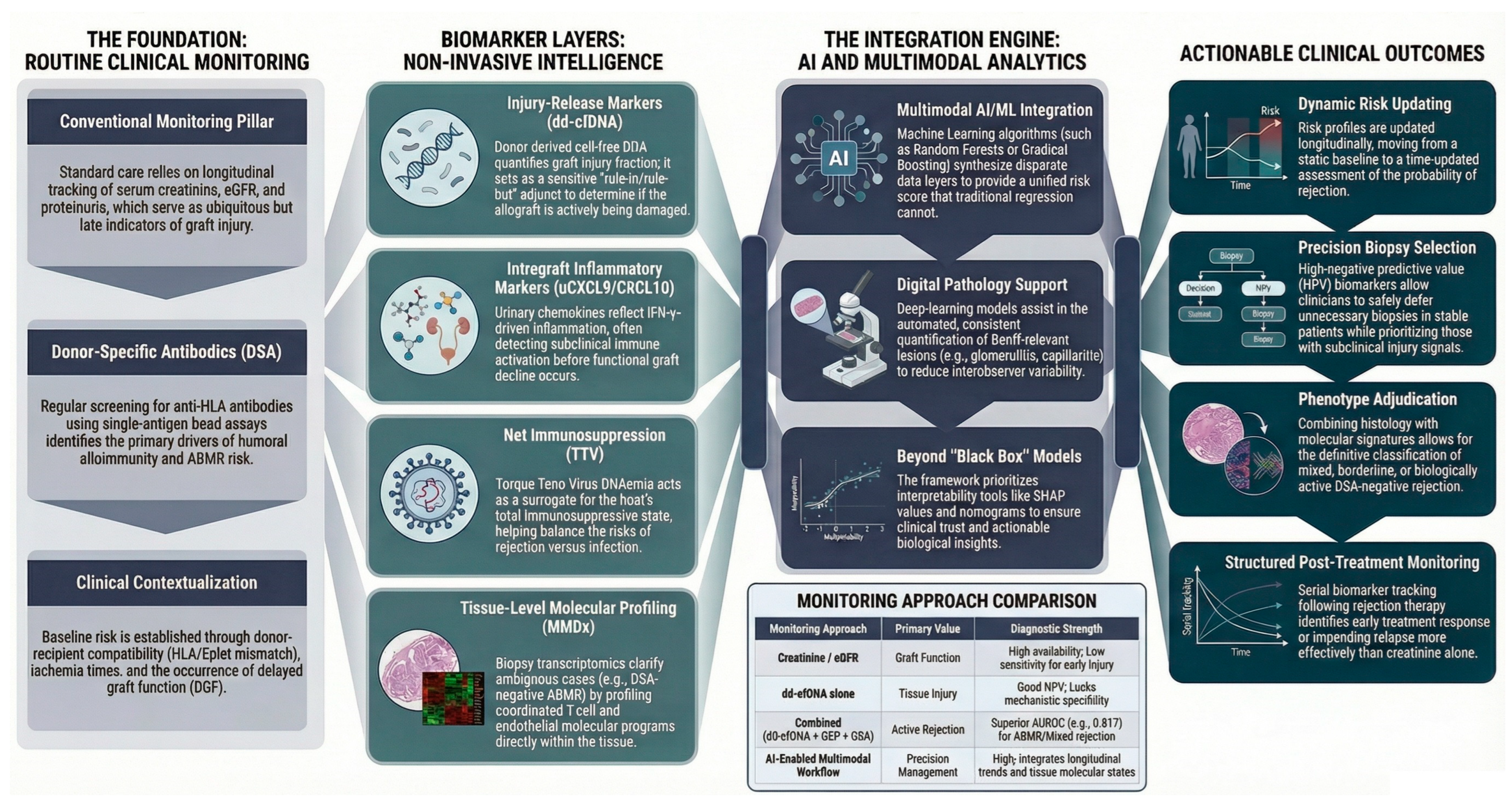 | Multimodal biomarker integration | dd-cfDNA, urinary chemokines, GEP, DSAs, biopsy, clinical data | Improve triage and dynamic risk stratification | Combines orthogonal signals; aligns well with precision medicine | Data harmonization and validation remain limited | Promising, not routine |