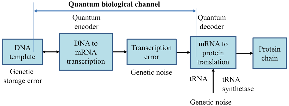 In Figure 1, we describe the generic quantum biological model suitable to study the flow of information from DNA to protein. The process of transcription is interpreted as encoding, the various errors introduced during replication, transcription or translation are considered as a source of genetic noise, while the process of translation is interpreted as decoding. Notice that this interpretation is consistent to the classical model defined by Yockey [10]. The process of translation is also prone to errors, which can also be contributed to the genetic noise. Therefore, all errors introduced in any stage shown in Figure 1 are called “genetic noise.” The transcription, DNA point mutations, insertions, deletions, and translation can all be interpreted as the quantum channel. It is assumed that genetic noise introduces random errors, which can be classified into several broad categories. The first types of errors, “storage errors,” occur in DNA itself as it is an imperfect storage of genetic information. The second types of errors are introduced during the DNA replication process. (For instance, the probability of error during replication is ~10−7 per base pair [15].) The third types of errors, transcription errors, are introduced during DNA to mRNA transcription process. The fourth type of errors, translation errors, is introduced during the translation process.