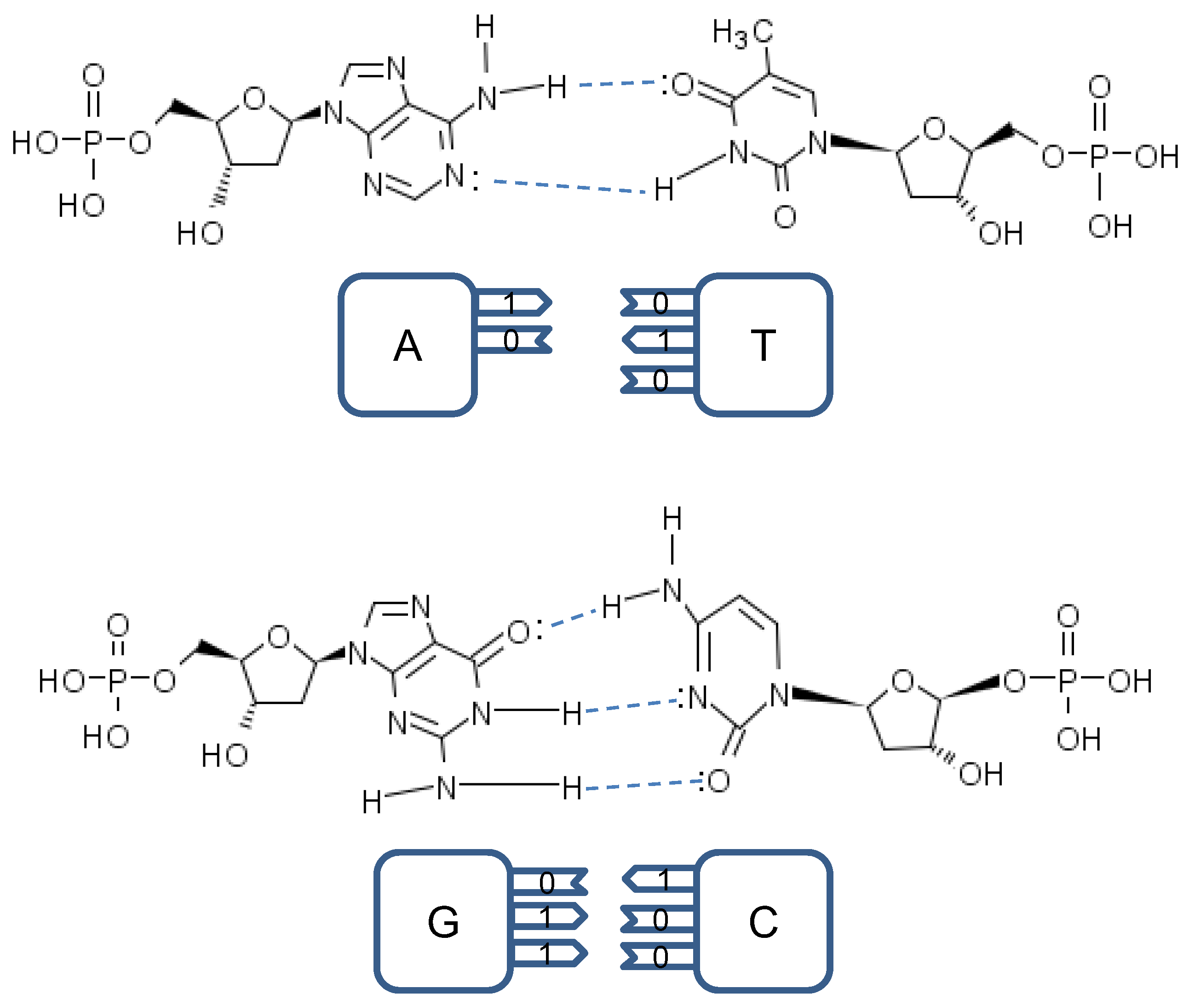 Standard nucleic acids’ pairing together with schematic representation. In schematic representation the symbol 1 is used to denote the “donor” of a proton, while symbol 0 to denote “acceptor” of a proton.