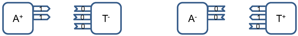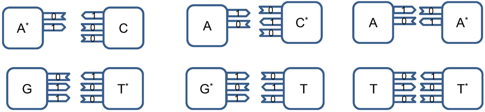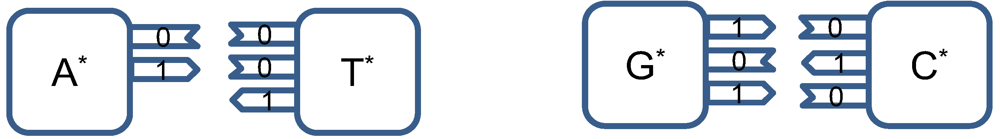 representing the hydrogen bond (H-bond), as shown in Figure 2. In the same figure, we provide the schematic representation in which the “donors” of protons are denoted with symbol 1, while the “acceptors” of protons are denoted with symbol 0. However, in tautomeric forms A*, G*, C* and T*, a proton involved in H-bond has been moved from one electron lone pair to another, which is illustrated in Figure 3. During either DNA replication or translation, the tautomeric nucleic acids bind with non-complementary nucleic acids introducing the mutations. For instance, tautomeric A* binds with C instead of T (U in mRNA), tautomeric C* binds with A, G* binds with T (U) and T* (U*) with G. It is also possible that both bases in DNA pair to be in the tautomeric forms as illustrated in Figure 4. Namely, when DNA is used for long-term storage of genetic information, the proton tunneling (tautomeric forms’ creation) can contribute to random errors introduction. The probability of occurrence of tautomeric nucleic acids’ forms is low so that it makes sense to assume that errors introduced by tautomeric forms are random. However, the presence of mutagens, carcinogens, electromagnetic radiation and/or proton bombardment can either increase the probability of occurrence of tautomeric forms or damage the bases, and consequently introduce the storage errors. In addition to increasing the rate of spontaneous mutations, the mutagens can cause the induced mutations due to deamination, oxidation, and alkylation. The DNA is the subject of continuous mutations and damages, and the cell has various mechanisms to deal with damages, including direct reversal (such as photoreactivation) mechanism, various damaged bases excising mechanisms (nucleotide excision repair-NER, base excision repair-BER and nucleotide mismatched repair-NMR), single-strand damage repair, double-strand breaks repair, and translesion synthesis (TLS). In this paper, we assume that only the point induced mutations, transitions or transversions, have remained upon the DNA repair process.