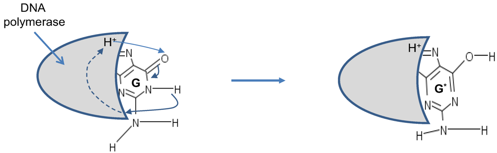 Tautomeric formation of G* by proton transfer between DNA polymerase (active region shown by shaded area) and G.