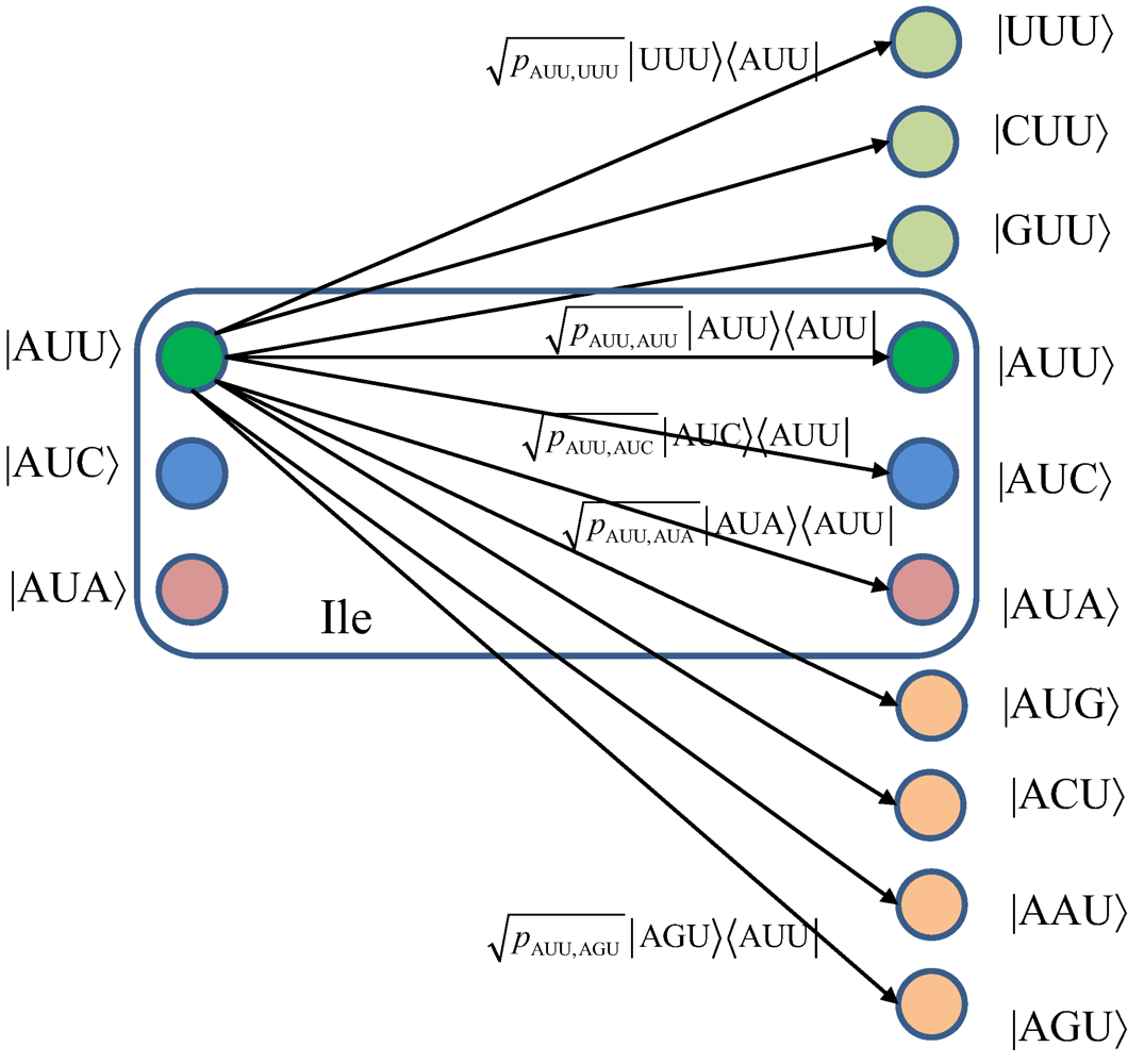 where pm describes the probability that a member of the ensemble (codon baseket) has been prepared in state |m⟩. For instance, m⋴{AUU, AUA, AUC} for Ile, and m⋴{UUU, UUC} for Phe. In scenario (ii), we assume that |Ile⟩-state is a superposition of eignekets of corresponding Hamiltonian [3]: