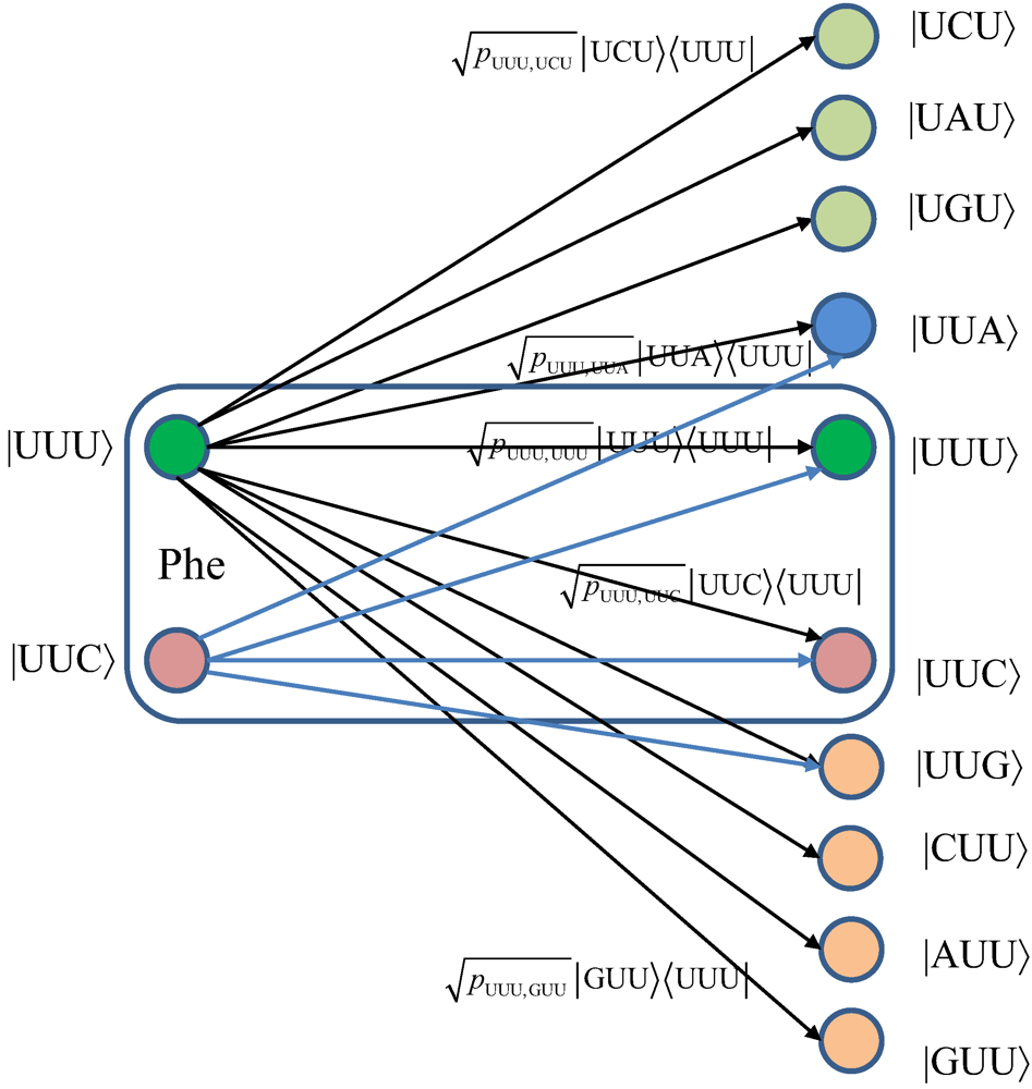 We turn our attention to the quantum channel model, which is applicable to all three scenarios discussed above. When the baseket |m⟩, representing one of codons (m), is transmitted over the quantum biological channel, it can be detected on the receiver (protein) side as baseket |n⟩ (n ≠ m) due to the presence of genetic noise. To completely characterize this quantum channel model it is essential to determine baseket transition probabilities. As an illustration, in Figure 7, we provide the transition diagram corresponding to Ile, while in Figure 8, we provide the transition diagram corresponding to Phe. For Ile, only transitions caused by single base error in baseket |AUU⟩ are shown. On the other hand, for Phe the single base error caused transitions for |UUU⟩ have been shown. Other transitions can easily be obtained by following the same strategy. With pm,n we denoted the transition probability from baseket |m⟩, representing the initial codon, to baseket |n⟩, representing the final codon; while corresponding Kraus operator is given by
