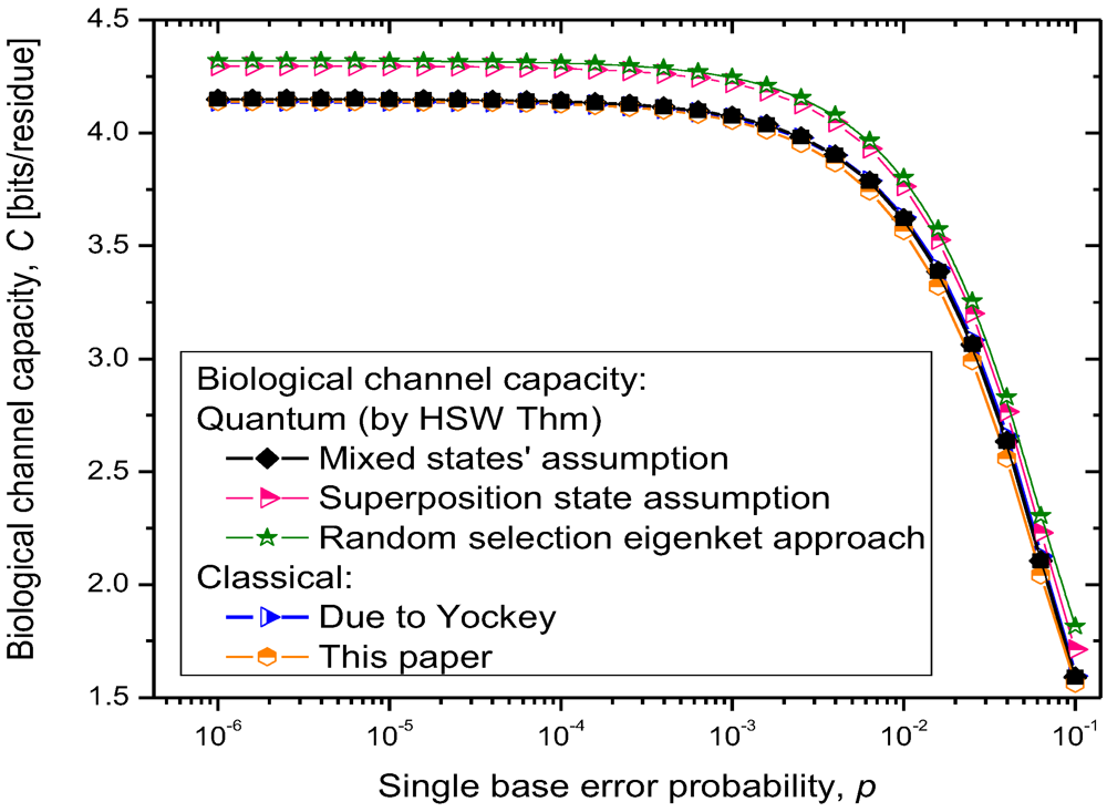 The results of quantum channel capacity with respect to the single base error probability are depicted in Figure 9. The results of calculations are obtained by using the Equations 6–8.