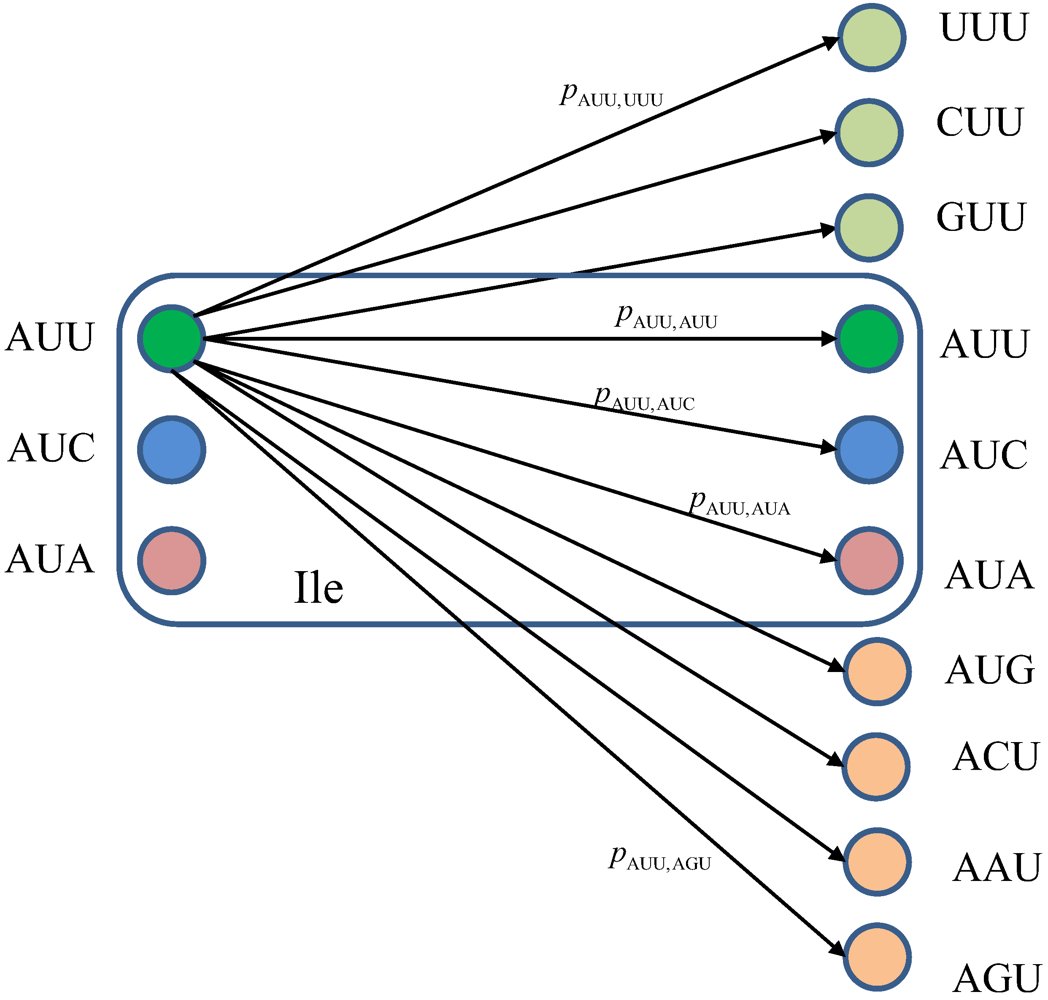 The classical biological channel transition diagram for codons corresponding to Ile. The pm,n denotes the transition probability from codon m to codon n, where m⋴{AUU,AUC,AUA} and n could be any of 64 codons.