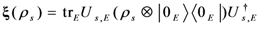 Clearly, the super-operator U cannot be unitary due to the decoherence effects. However, the total evolution operator of quantum system and environment (ambient) can be represented by unitary operator Us,E . Without loss of generality, let us assume that the environment (ambient) E is initially in a pure state |0E⟩. Hence, the expression for super-operator under this initial condition can be written as Equation 1.