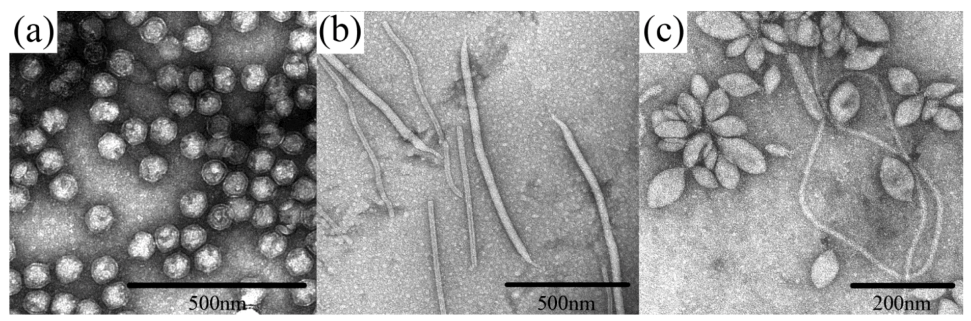 - Pietila, M.K.; Laurinmaki, P.; Russell, D.A.; Ko, C.C.; Jacobs-Sera, D.; Butcher, S.J.; Bamford, D.H.; Hendrix, R.W. Insights into head-tailed viruses infecting extremely halophilic archaea. J. Virol. 2013. [Google Scholar]