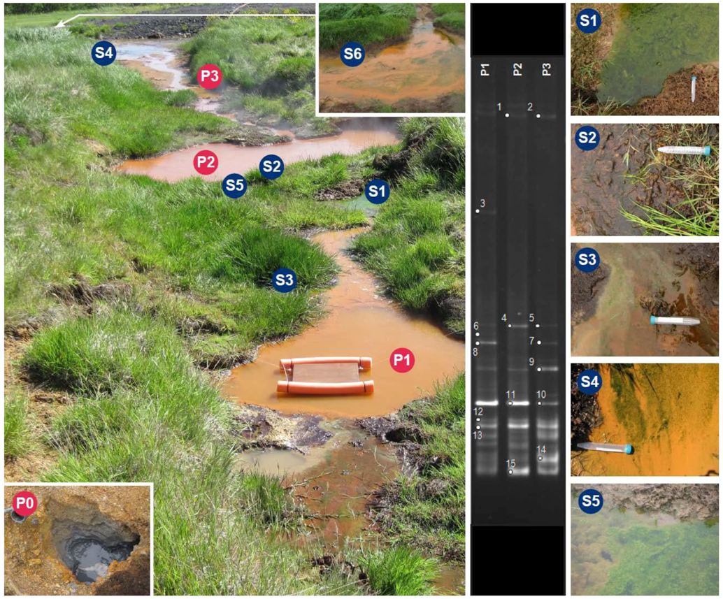 Coordination Action for Research Activities on Life in Extreme Environments (CAREX) hot spring. Picture of the CAREX hot spring system (left photo) and sampling sites, pool 1, 2 and 3, and its specific sampling sites. Different pools of the hot-spring system were sampled: pool 1 (P1), pool 2 (P2), pool 3 (P3) and Pool 0 (P0) (inserted photo in lower left corner). The “Biofilm Catcher” is shown in pool 1 (P1). 16S rRNA polymerase chain reaction (PCR)-denaturing gradient gel electrophoresis (DGGE) profiles of the bacterial communities in the water of the three pools (P1, P2 and P3) are shown on the gel photo in the middle. Circles on the bands indicate the DNA fragments that were excised from the gel and successfully amplified and sequenced. Sampling sites for measurements of photochemical activity of microbial mats and higher plants with FluorCam are marked S1, S2, S3 and S4 in the photo of system and enlarged in four photos on the right side of the figure. An enlarged photo of site S5 is also on the right side of the figure (bottom). Site S6 can't be visualized in the photo of the CAREX hot spring and is therefore shown enlarged on the right corner, at the top of the photo.