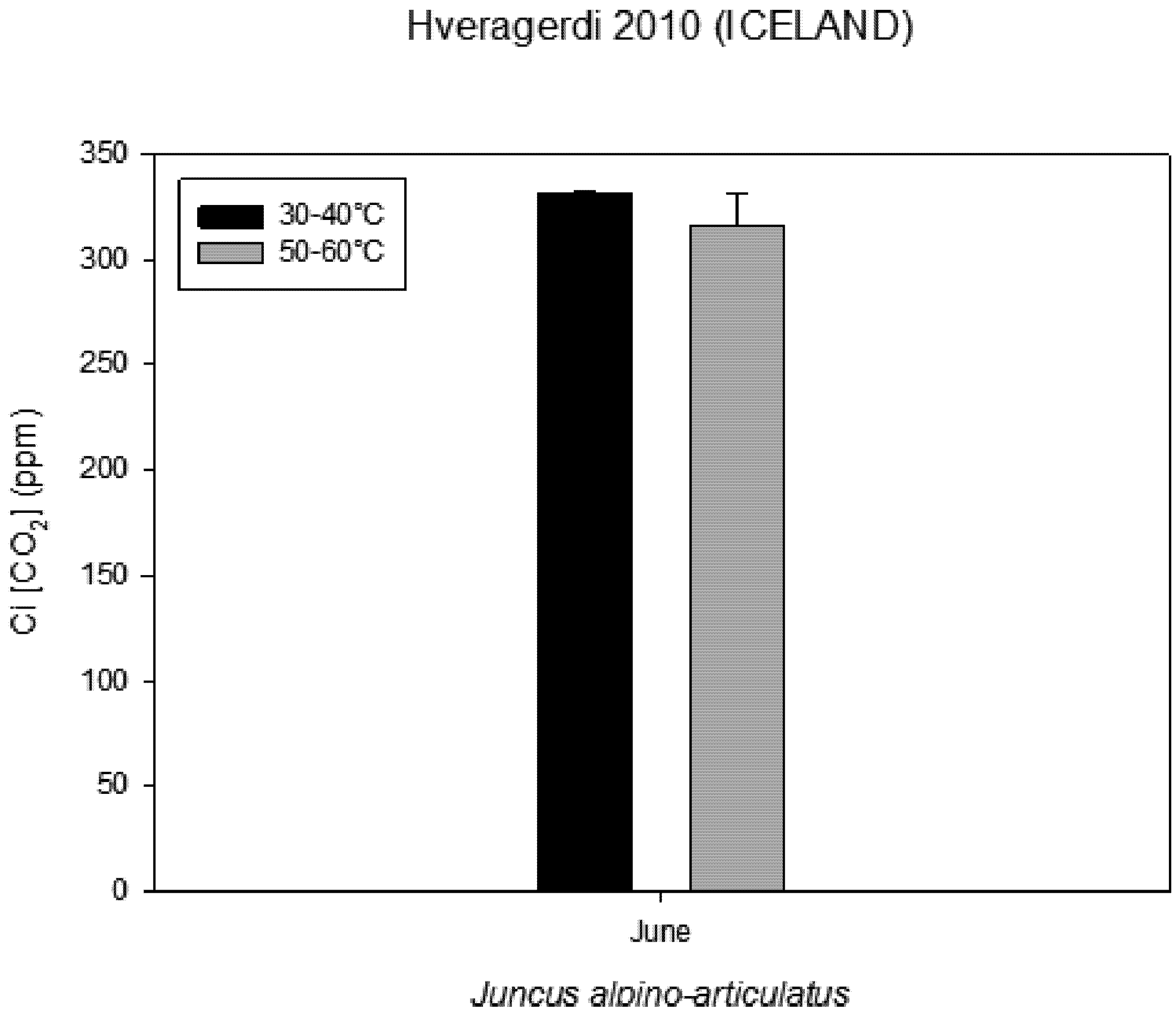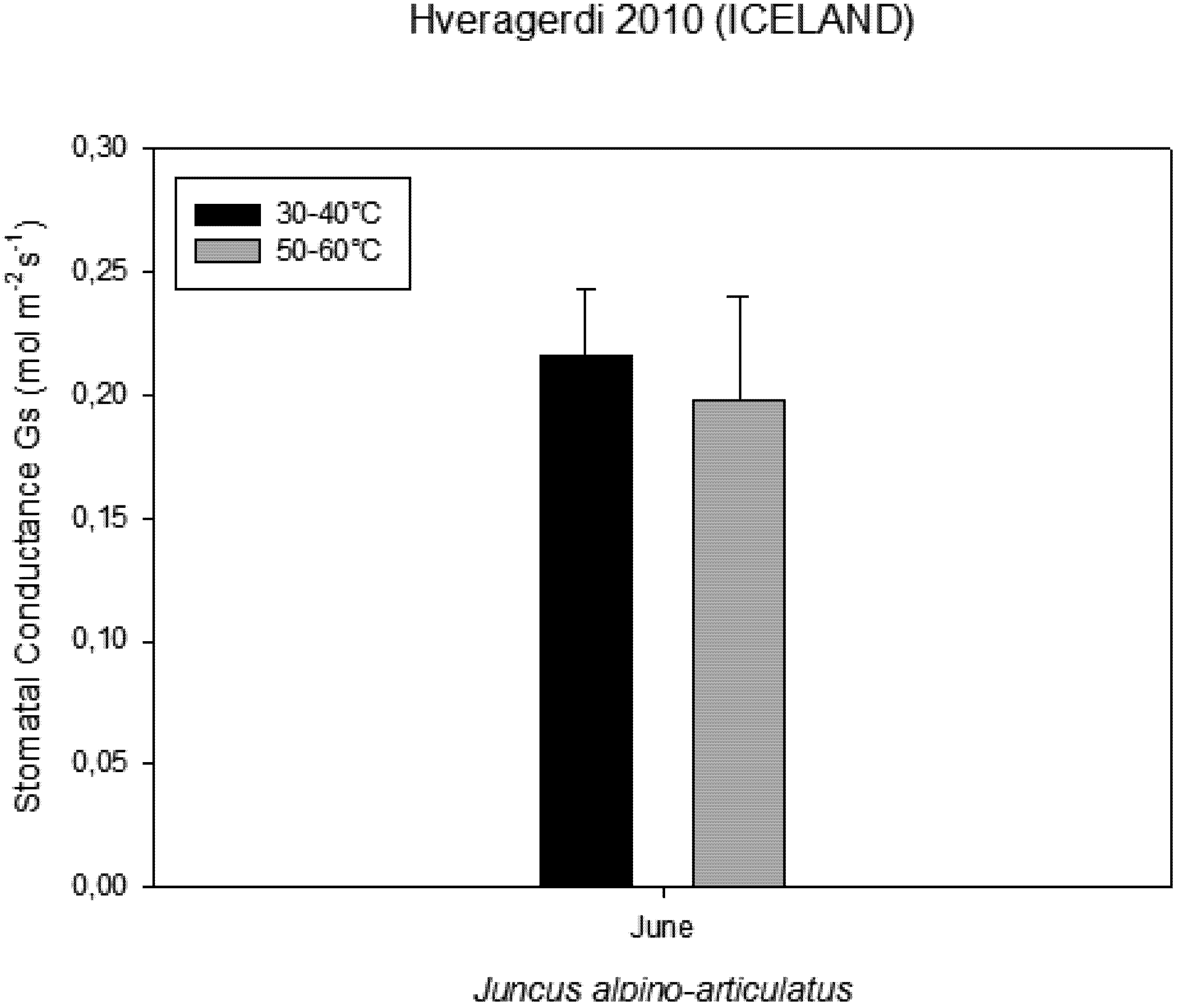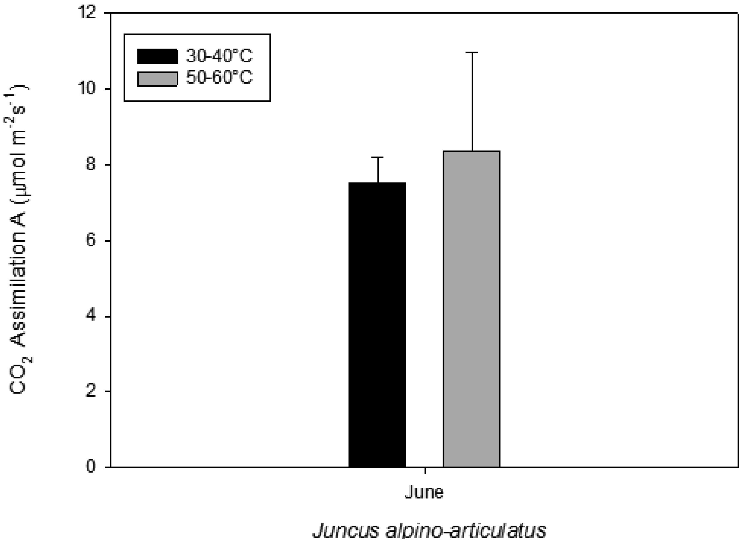 Juncus does not seem to be stressed by high temperatures, and significant differences were found in photochemical parameters derived from fluorescence measurement (F