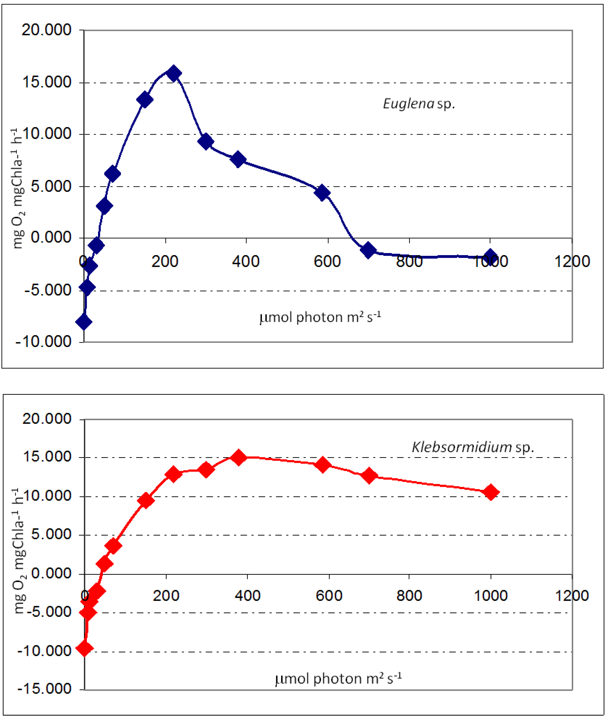 The measurements of photosynthetic performance of biofilms were different between species in different sites. While Euglena sp. cells showed photo-inhibition behavior, the biofilms formed by Klebsormidium sp. were photo-saturated.