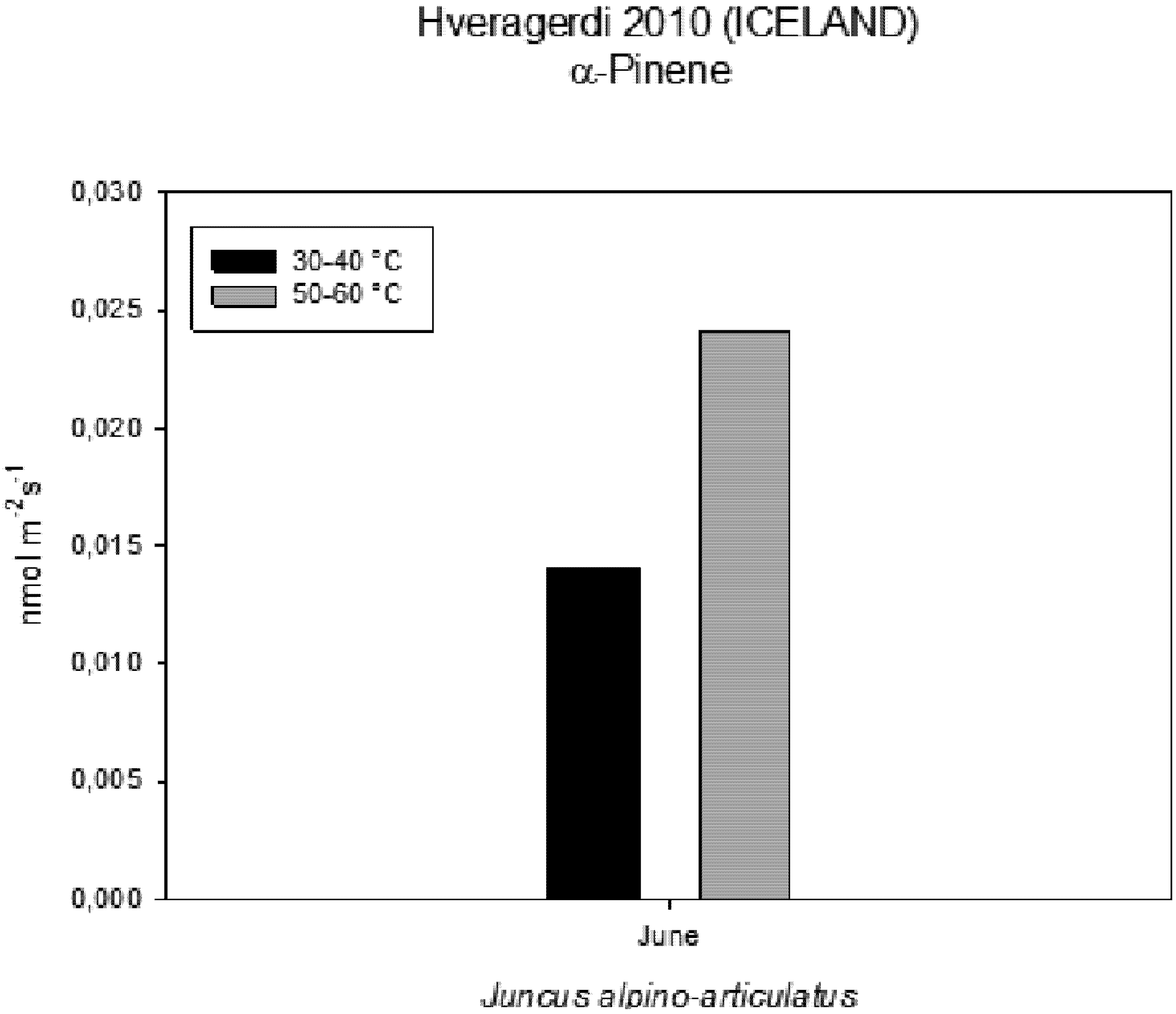 VOCs emitted from plants growing near a hot spring at two different temperatures.