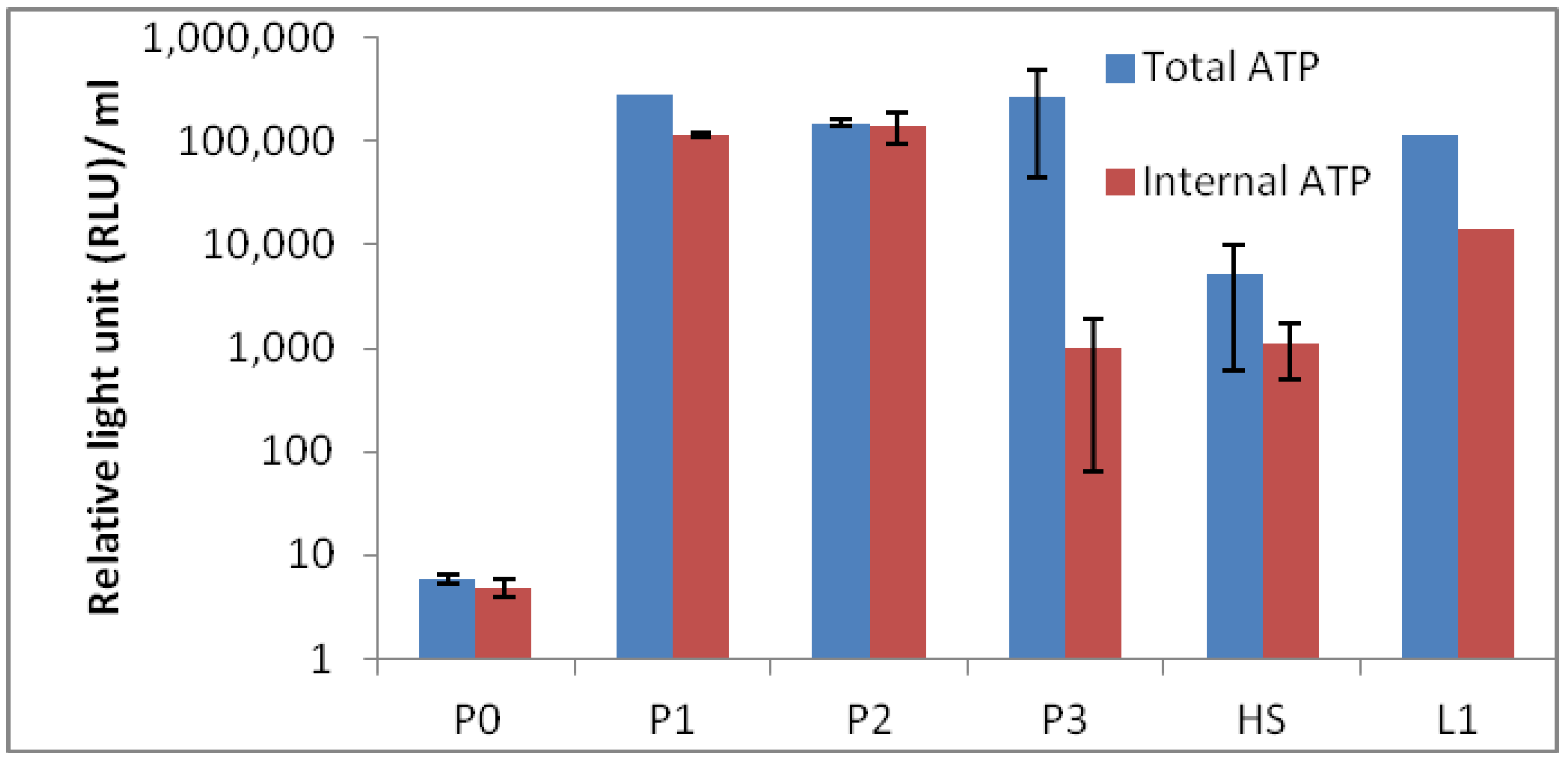 Results of total and internal adenosine triphosphate (ATP) results are depicted in