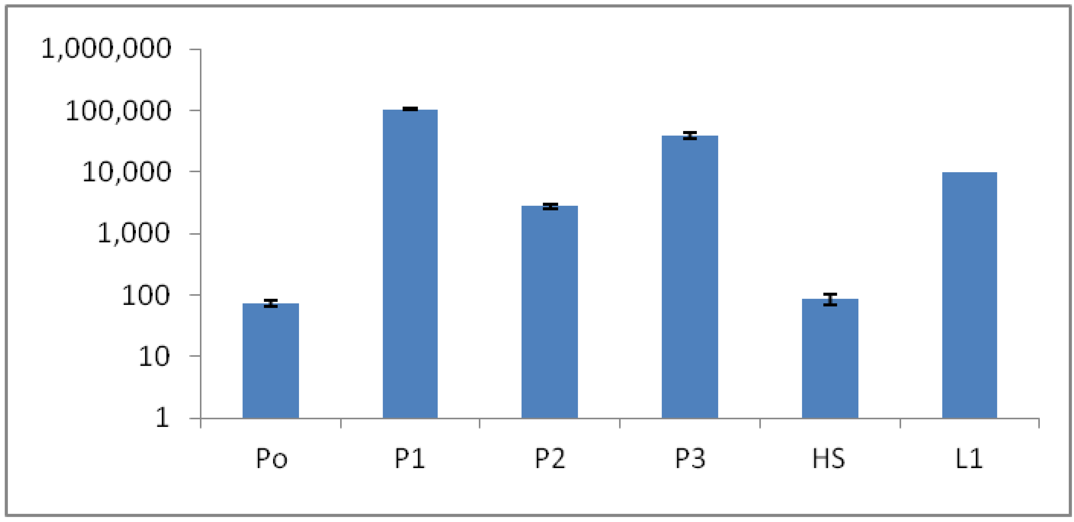 Figure 10). These variances could have possibly been explained by some difficulty in DNA extractions, especially from the P0 sample. Bacterial cells can lyse differently, depending on degenerating agents and conditions, but environmental chemicals could also interfere with the DNA yield and PCR performance. The 16S rRNA copy number was significantly lower in P0 and HS1 samples, compared to other sites (