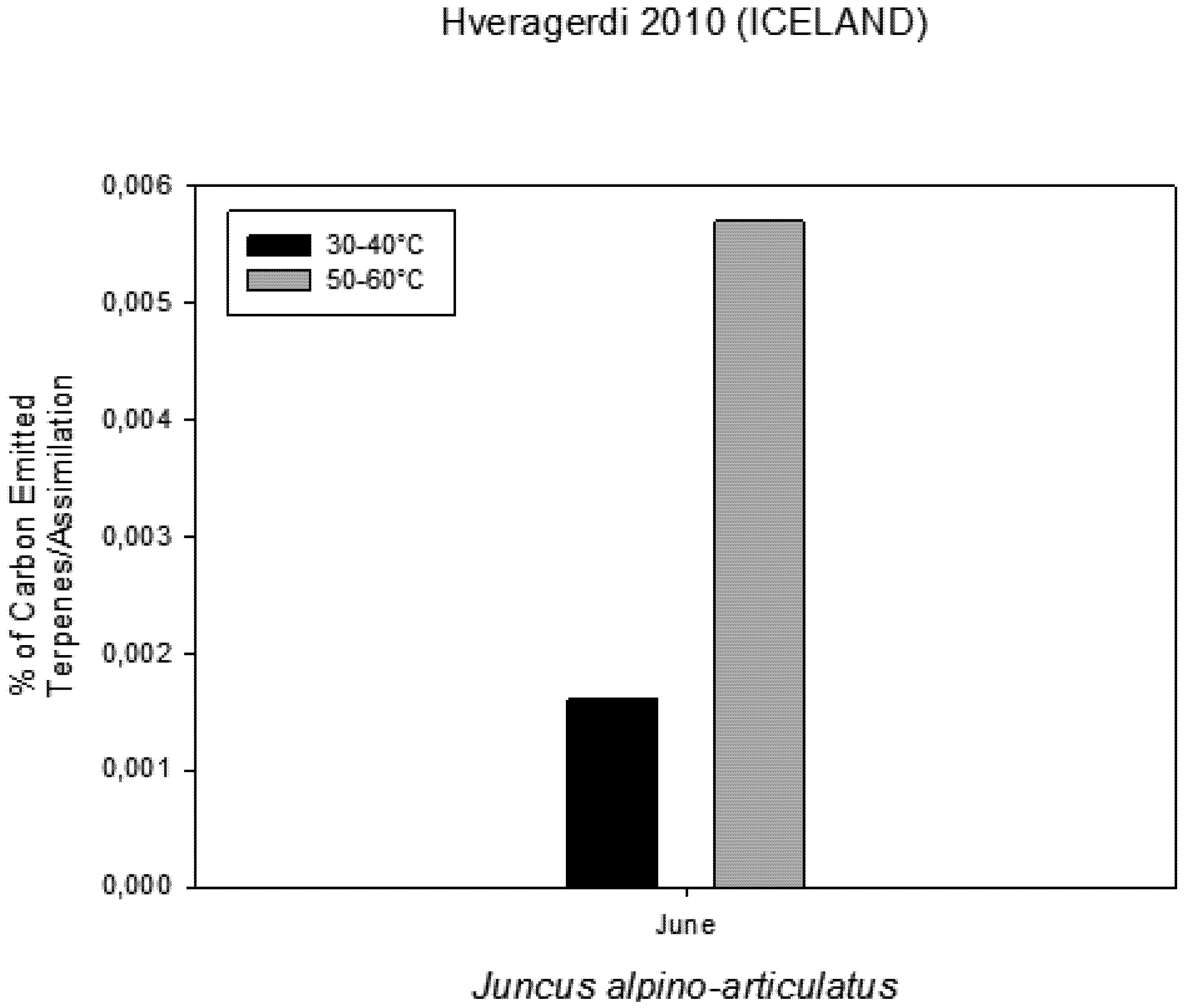 Percentage of Carbon emitted as VOCs in comparison with carbon assimilated through photosynthesis measured on plants growing near a hot spring at two different temperatures.