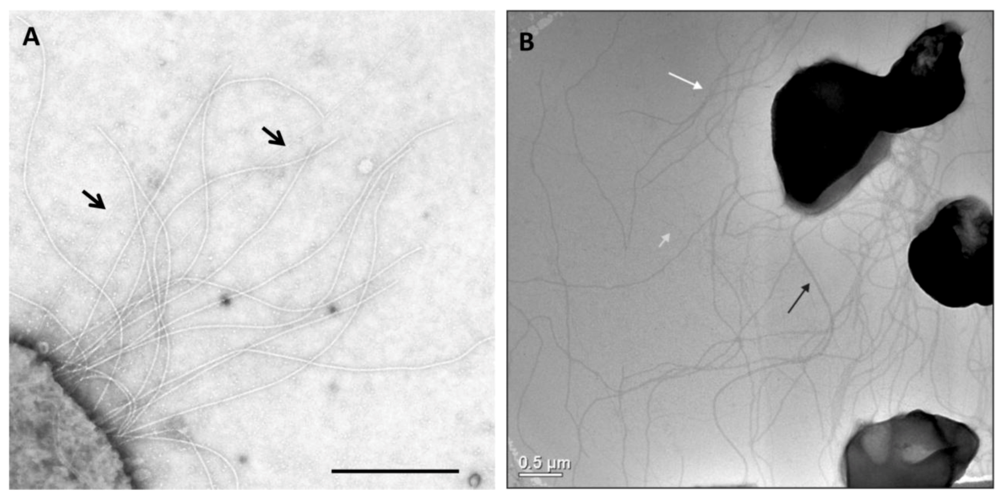 Appendages on the well-studied Archaea M. maripaludis and S. acidocaldarius. (A) Electron micrograph of M. maripaludis showing thin pili (arrows) with thicker and more numerous archaella. Bar = 0.5 µm. Courtesy of S.I. Aizawa. Prefectural University of Hiroshima, Japan. (B) Electron micrograph of S. acidocaldarius showing the presence of three different appendages namely archaella (14nm diameter, black arrow), Aap pili (10–12 nm, white arrow) and threads (5 nm, grey arrow). Bar = 0.5 µm. Courtesy of A.-L. Henche and S.V. Albers, Max Planck Institute for Terrestrial Microbiology, Marburg Germany.