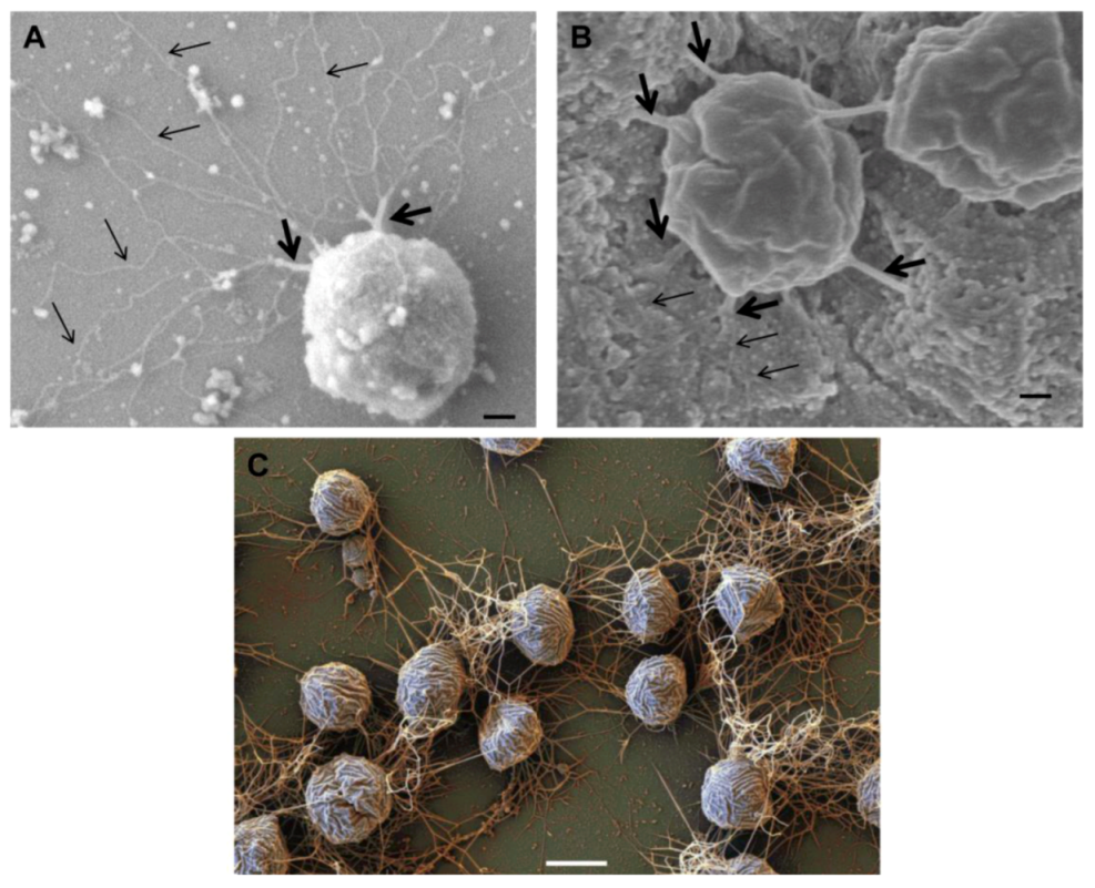 Role of archaella in attachment of Archaea to surfaces and other cells. Scanning electron micrograph of M. maripaludis attached to silicon wafer via thick cables of archaella (thick arrows) which can unwind to individual archaellar filaments (thin arrows). Bar = 100 nm (B). Connection of M. maripaludis cells to each other and underlying nickel EM grid via archaellar bundles. (A) and (B) reprinted from [31]. Bar = 100 nm (C). Scanning electron micrograph showing attachment of Mcc. villosus cells to a surface and to other cells via bundles of archaella. Bar = 1 µm. Courtesy of Gerhard Wanner, University of Munich, Germany.