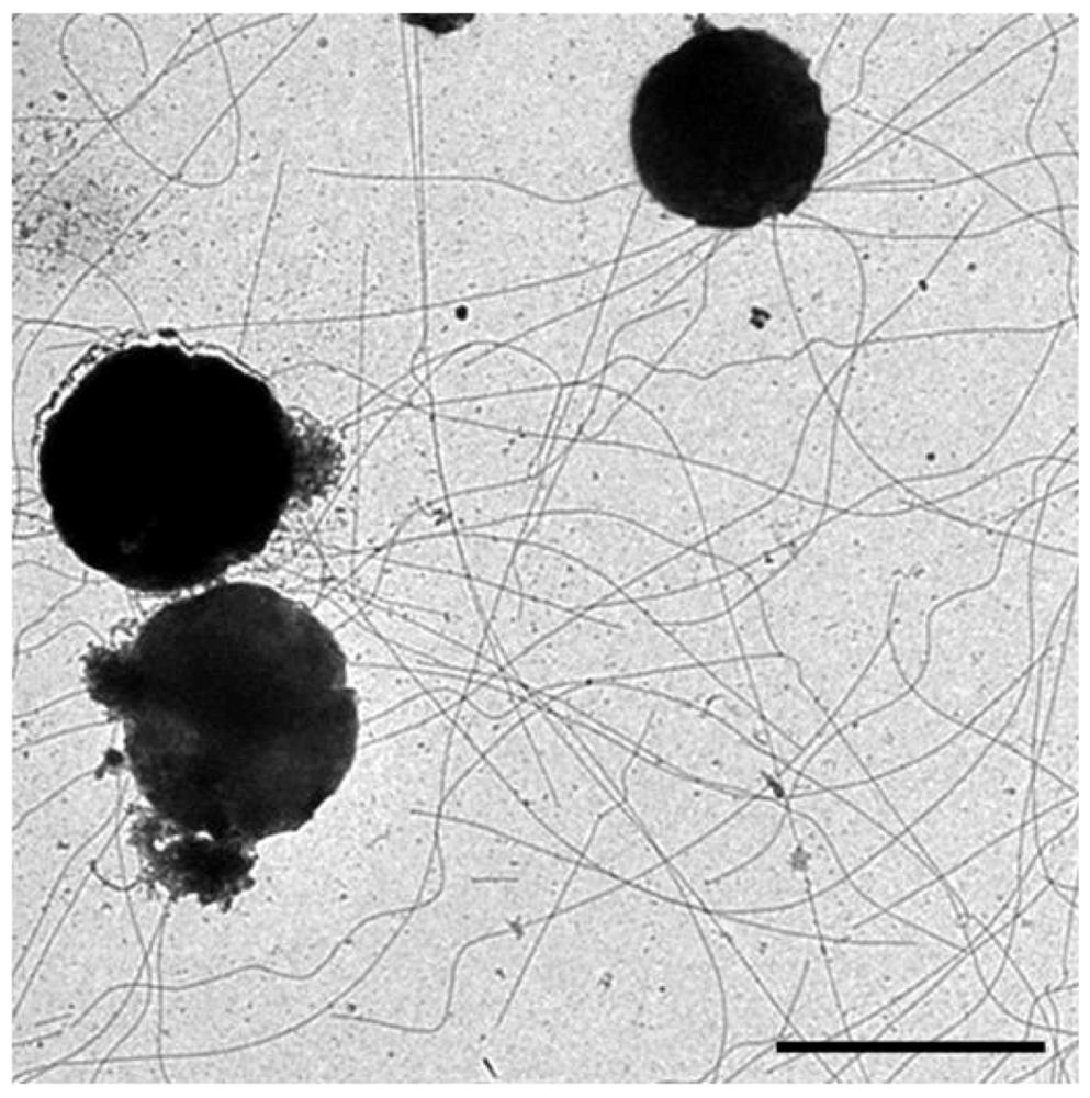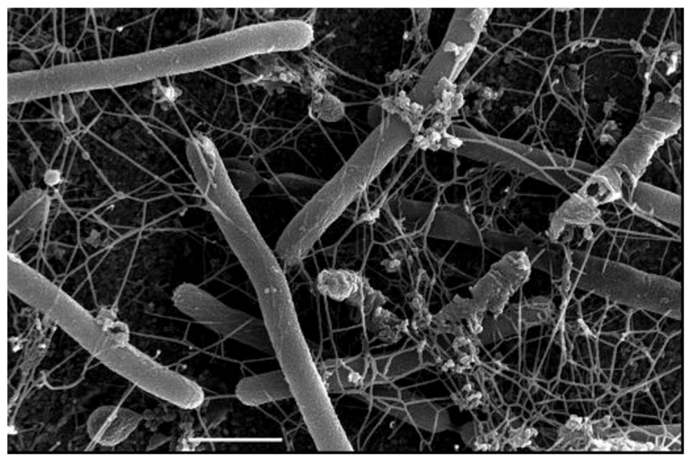 Scanning electron micrograph of M. thermautotrophicus grown on gold EM grids and expressing many Mth60 fimbriae. Bar = 1µm. Courtesy of Gerhard Wanner, University of Munich, Germany.