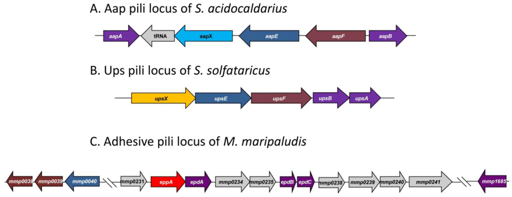 Type IV pili-like loci found in three different Archaea. Functionally similar genes are given identical colors. (A) The adhesive pili locus of S. acidocaldarius showing the pilin-like genes aapA/B, the iron sulfur oxidoreductase (aapX), the ATPase (aapE) and the inner membrane protein (aapF). (B) The UV-inducible pili locus of S. solfataricus contains genes for two pilin (upsA and upsB), an ATPase (upsE) and a conserved membrane protein (upsF) as well as a protein of unknown function (upsX) and (C) The adhesive pili locus found in M. maripaludis contains genes for three minor pilins (epdA,B,C), a prepilin peptidase (eppA) and a number of proteins of unknown function. Located outside this locus are genes for the ATPase (MMP0040), inner membrane proteins (MMP0038 and MMP0039) and the major pilin gene (MMP1685).