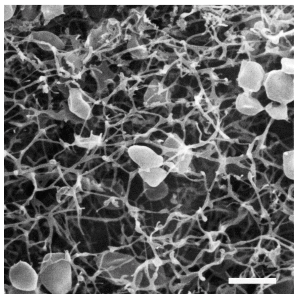 A distinctive feature of species of the hyperthermophilic genus Pyrodictium is that individual cells grow in a network of extracellular tubules called cannulae (Figure 8) [8]. Cannulae have an outer diameter of 25 nm and appear empty when thin-sectioned or cross-fractured. The cannula structure itself is composed of at least three related glycoproteins, termed CanA, CanB and CanC, with molecular masses in the 20–24 kDa range. The N-terminal 25 amino acids of each protein are identical [8] and Can proteins were reported to contain signal peptides [119]. The genes encoding the three cannulae protein subunits (canA, canB and canC) were identified [119] and later published in a patent application [120]. The overall cannula structure is remarkably heat resistant and insensitive to denaturing conditions; no loss of structure was observed even after incubation at 140 °C for 60 min or at 100 °C in 2% SDS for 10 min [8].