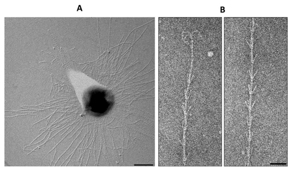 Ups pili, with a diameter of 10 nm but of variable lengths, are peritrichously located on the surface of different Sulfolobus species [34,36]. The structure of S. solfataricus Ups pili showed straight fibers consisting of three evenly spaced helices with a pitch of 15.5 nm.