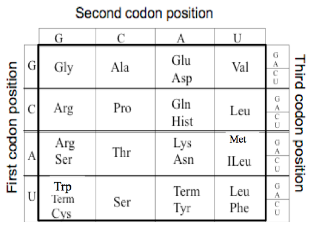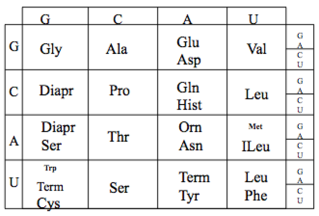 The Genetic Code. The table has been reoriented Displaying the four RNA nucleotides in the non-standard order, Guanosine monophosphate, G; Cytosine monophosphate, C; Adenosine monophosphate, A; and Uridine monophosphate, U; to encode the 20 amino acids: Glycine (Gly), Alanine (Ala), Arginine (Arg), Proline (Pro), Threonine (Thr), Serine (Ser), Cysteine (Cys), Glutamic Acid (Glu), Glutamine (Gln), Aspartic Acid (Asp), Asparagine (Asn), Lysine (Lys), Histidine (Hist), Valine (Val), Leucine (Leu), Isoleucine (ILeu), Methionine (Met), Phenylalanine (Phe), Tyrosine (Tyr), Tryptophan (Trp) and the peptide termination codons, Term.
