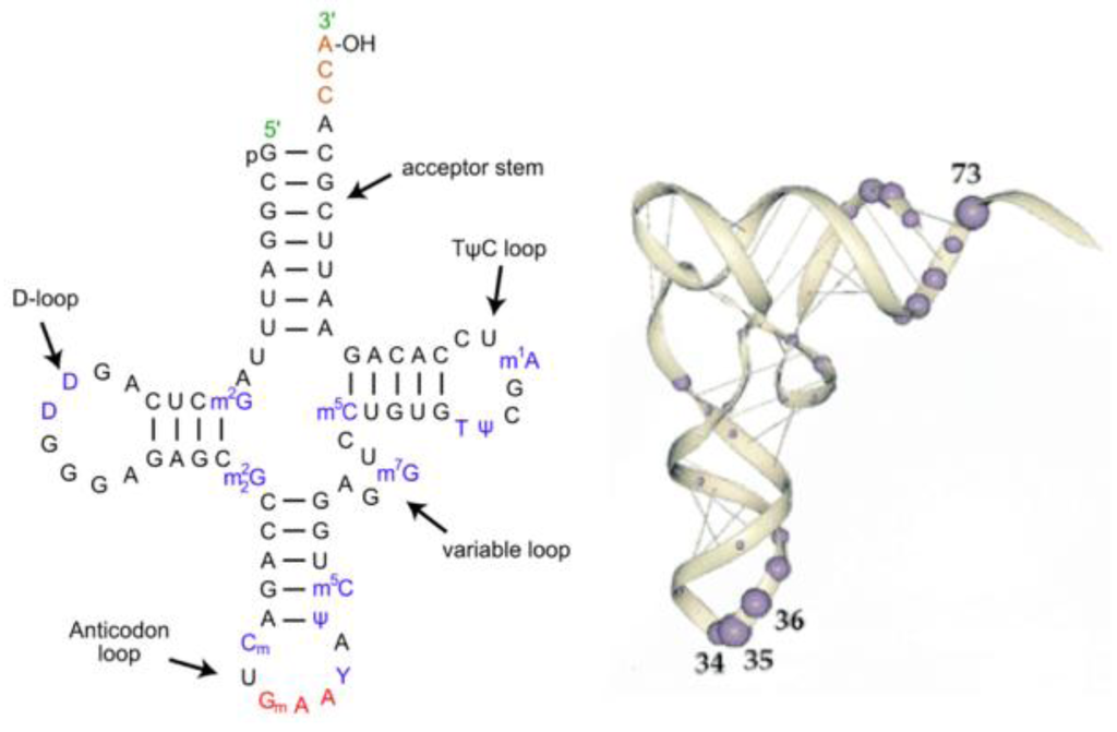 The tRNA structure. The Left-hand side is a representation of tRNA’s secondary structure. The stem loop and acceptor arm contain invariant GC nucleotides, as does The D loop, and the TΨCG loop and the UCCA of the acceptor arm. The Right-hand side is an RNA backbone representation of the 3D folded structure, with the most common Aminoacyl-tRNA synthetase contact base positions highlighted.