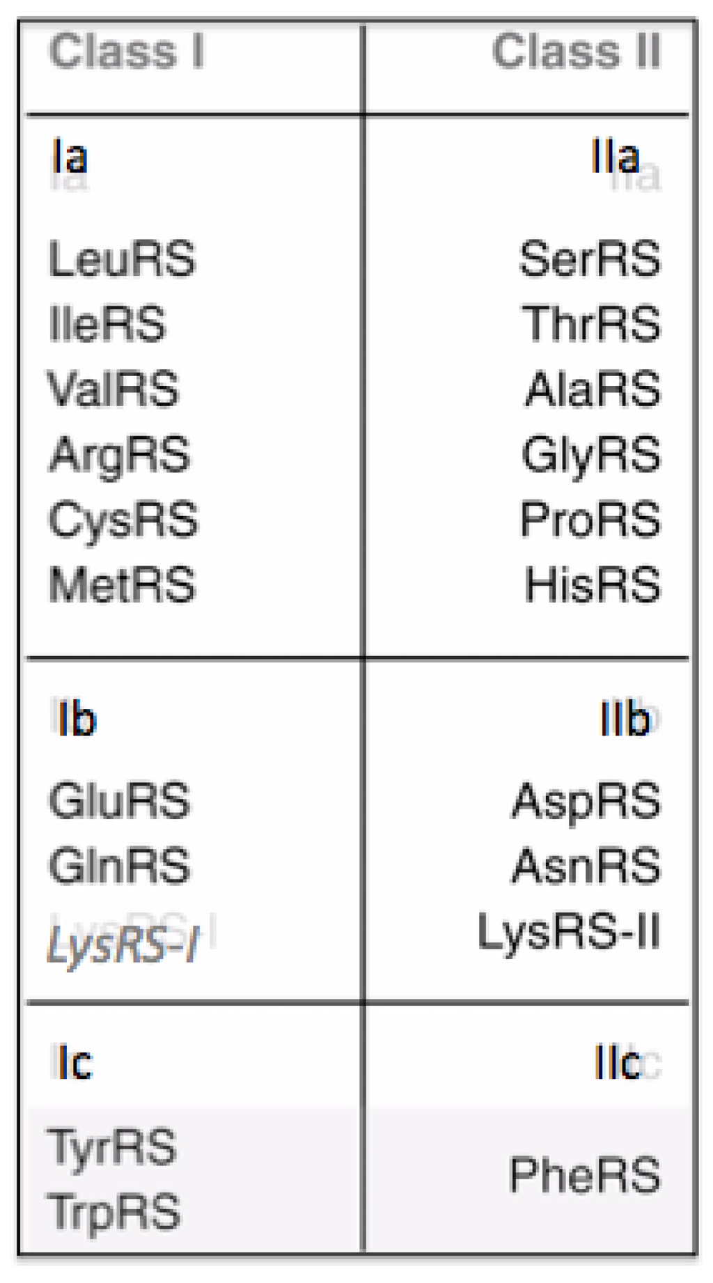 The 20 amino acids and their associated Aminoacyl tRNA synthetases. Lysine appears twice however the Class I version only appears in a few organisum in which there is not a Class II version.