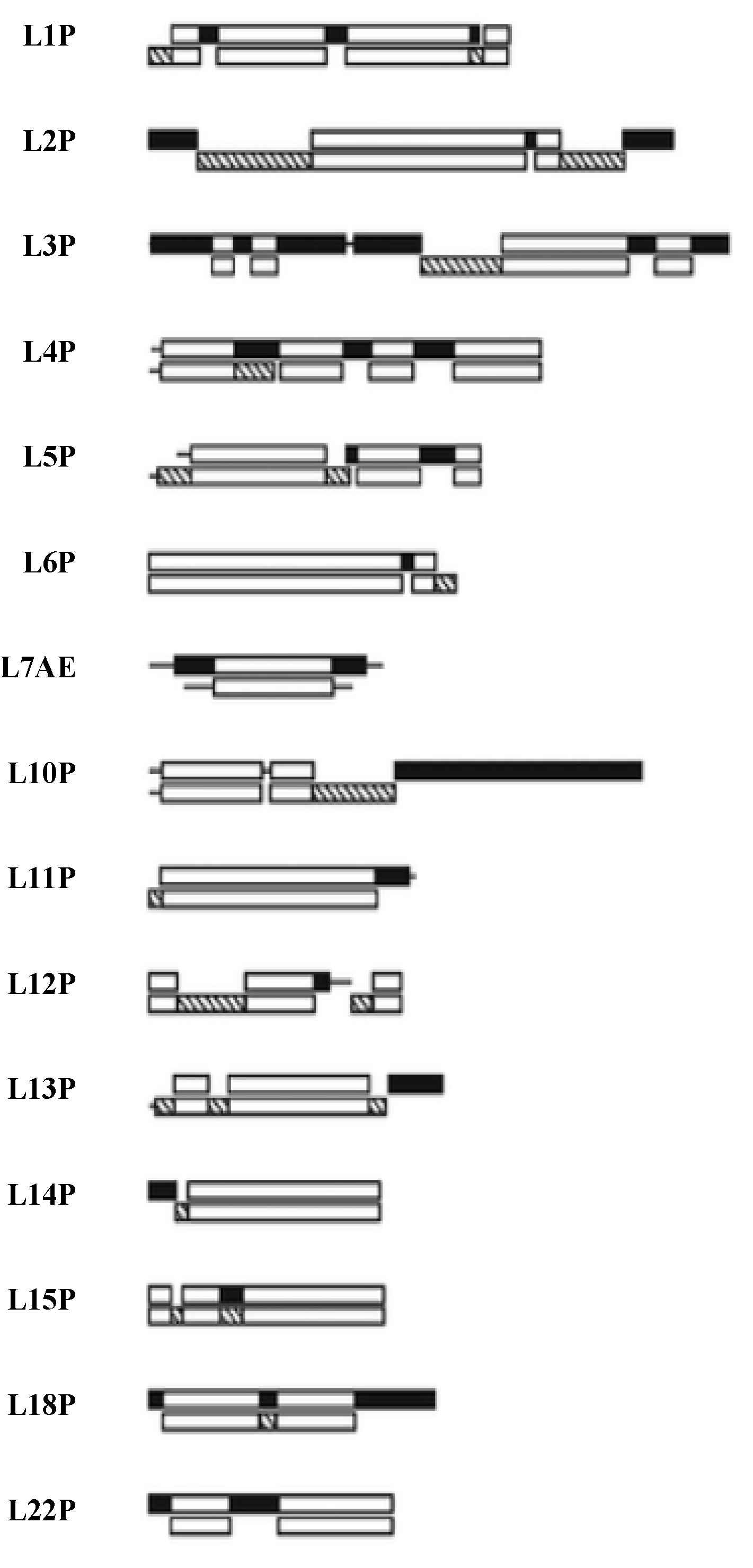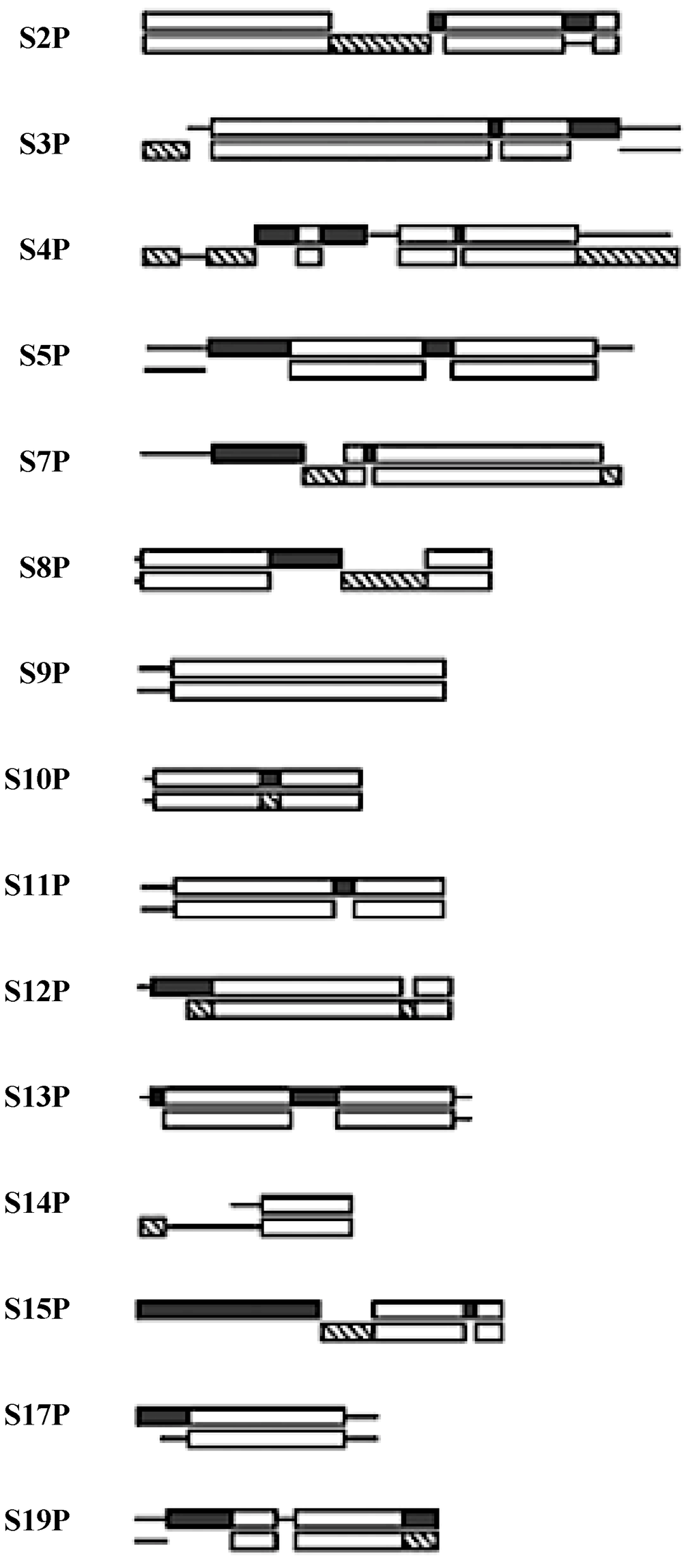 The SSU protein block structure. Universal peptides blocks are in white, the Bacterial blocks (bottom) are in hashed and the Archael (top) blocks in black [21].