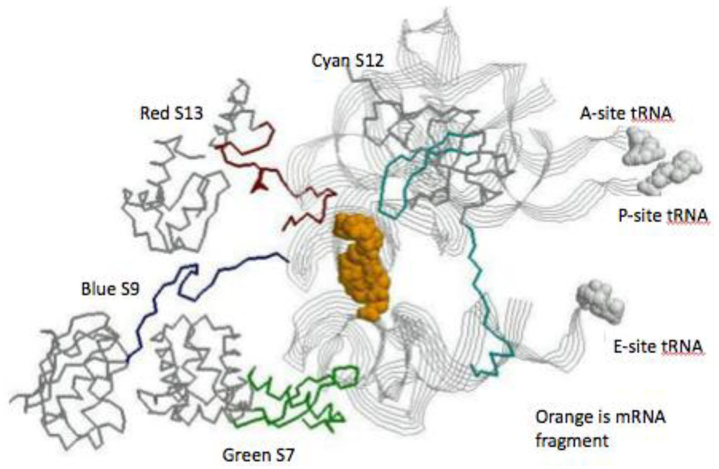 Five of the 15 universal SSU proteins (S2, S3, S4, S14, S15) are globular in structure while the other ten (S5, S7, S8, S9, S10, S11, S12, S13, S17, S19) have peptide extensions in addition to their globular portion. The majority of the globular domains are found on the SSU surface while the extensions reach into the ribosome’s interior [22]. Six of these universal proteins (S5, S7, S8, S10, S12, S17) have hairpin extensions while S9, S11, S13, S19 have N- and/or C-terminals extensions. The extensions of S7, S9, S12, and S13 are found at the decoding site of the SSU, see Figure 5.