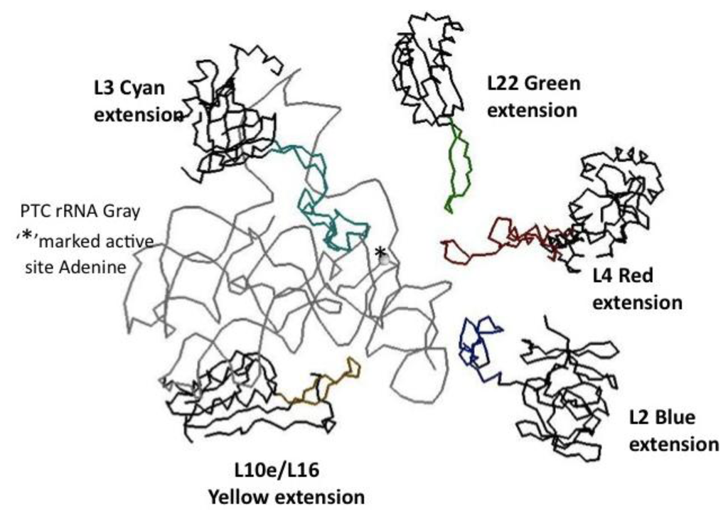 The early ribosome is believed to have evolved about the LSU active site, the Peptidyl Transfer Center (PTC) core [27,28,31]. The four LSU universal proteins, L2, L3, L4, and L22 have extensions reaching into this PTC and are involved in the early large subunit folding as well. Fox [32], thus, proposed that L2, L3, L4, and L22 are likely to contain the earliest peptides of the translational apparatus. Even more recently, in a major effort to model the ancestral ribosome, Hsiao et al. [33] demonstrated that the extensions of L2, L3, L4, L15, and L22 would all react with their LSU rRNA core model and they co-precipitated with said core.
