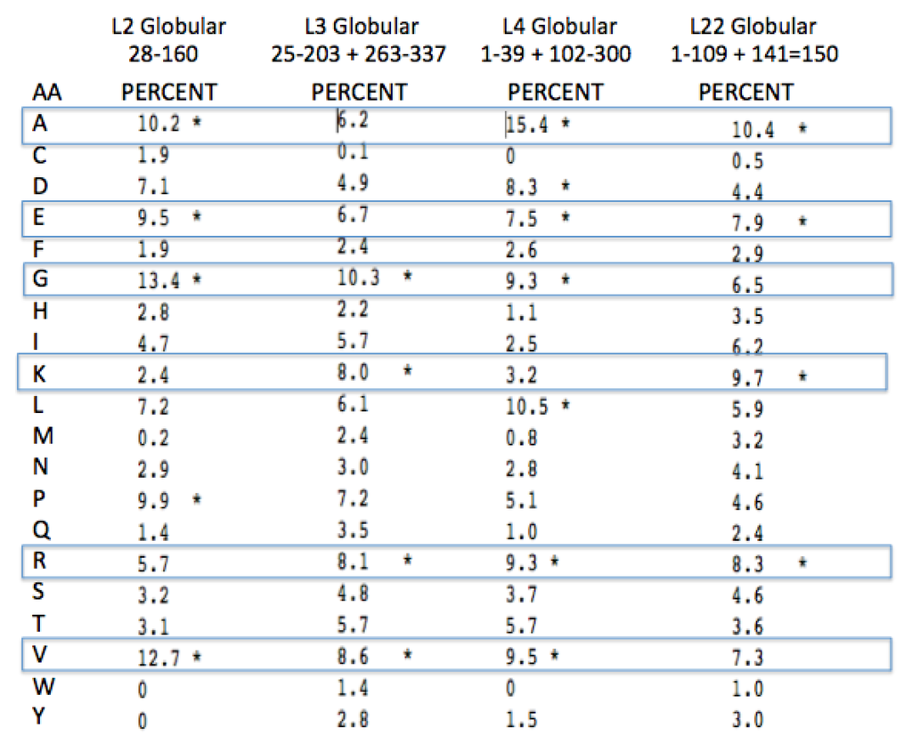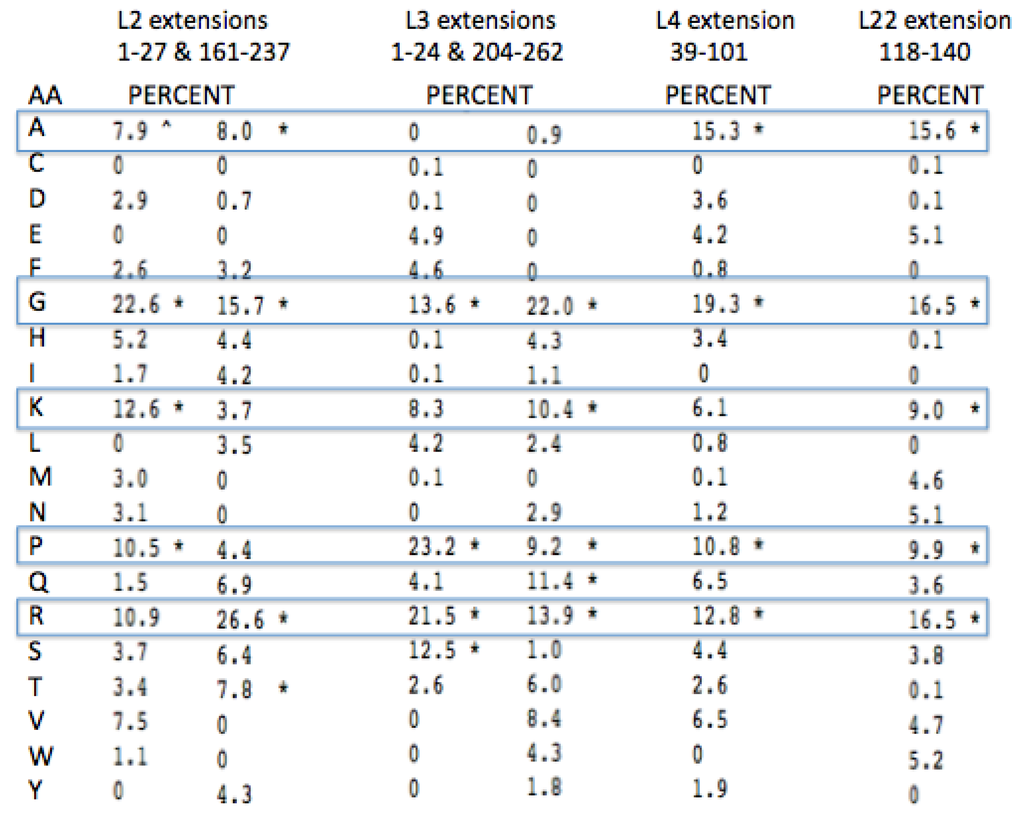 A set of seed sequences were then chosen based on the least similar sequences from the above pairwise initial searches. Thus, these search seed sequences are a set of maximally dissimilar or distinctly related representative. These seeds sets contained five to ten sequences, depending on the overall conservation of that particular protein and/or its extension. At least one of these seed sequences was chosen with known three-dimensional structure. The latter ensured that we had the correct boundaries between the peptide extensions and globular domains. Each seed sequence for each protein globular domain and each extension was then search again with Blast (NCBI) against all available Archaea to produce a second set of pairwise alignments. For each ribosomal protein these were combined, again after highly similar pairwise alignments were again removed. This generated a pairwise alignment data set for each protein’s globular and extension domains. From these data sets, the number of times each of the 20 amino acids was common or shared in an alignment between the seeds and searched sequences was recorded. The number of alignments varied slightly for different LSU proteins from just under one hundred to nearly 300 hundred, as these proteins are not all identified in the same set of Archaea found in GenBank (NCBI). These data were then converted to a percentage normalized to the total number of all pairwise common amino acids for each protein domain or extension.
