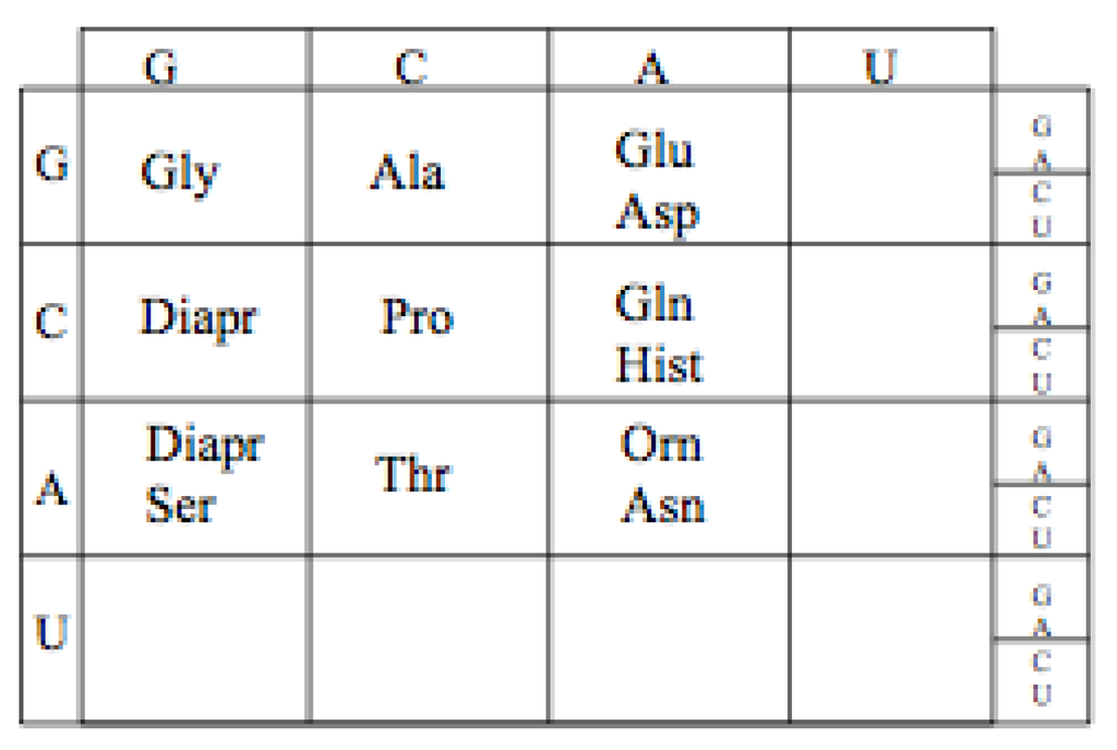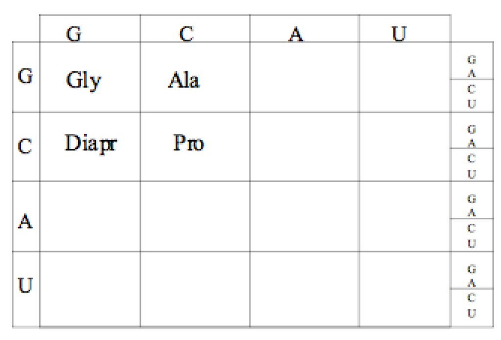 Our conclusion is that the earliest Genetic Code was a GC code, coding for Glycine, Alanine, Proline and Diamino proprionic acid (Diapr) as shown in Figure 10.