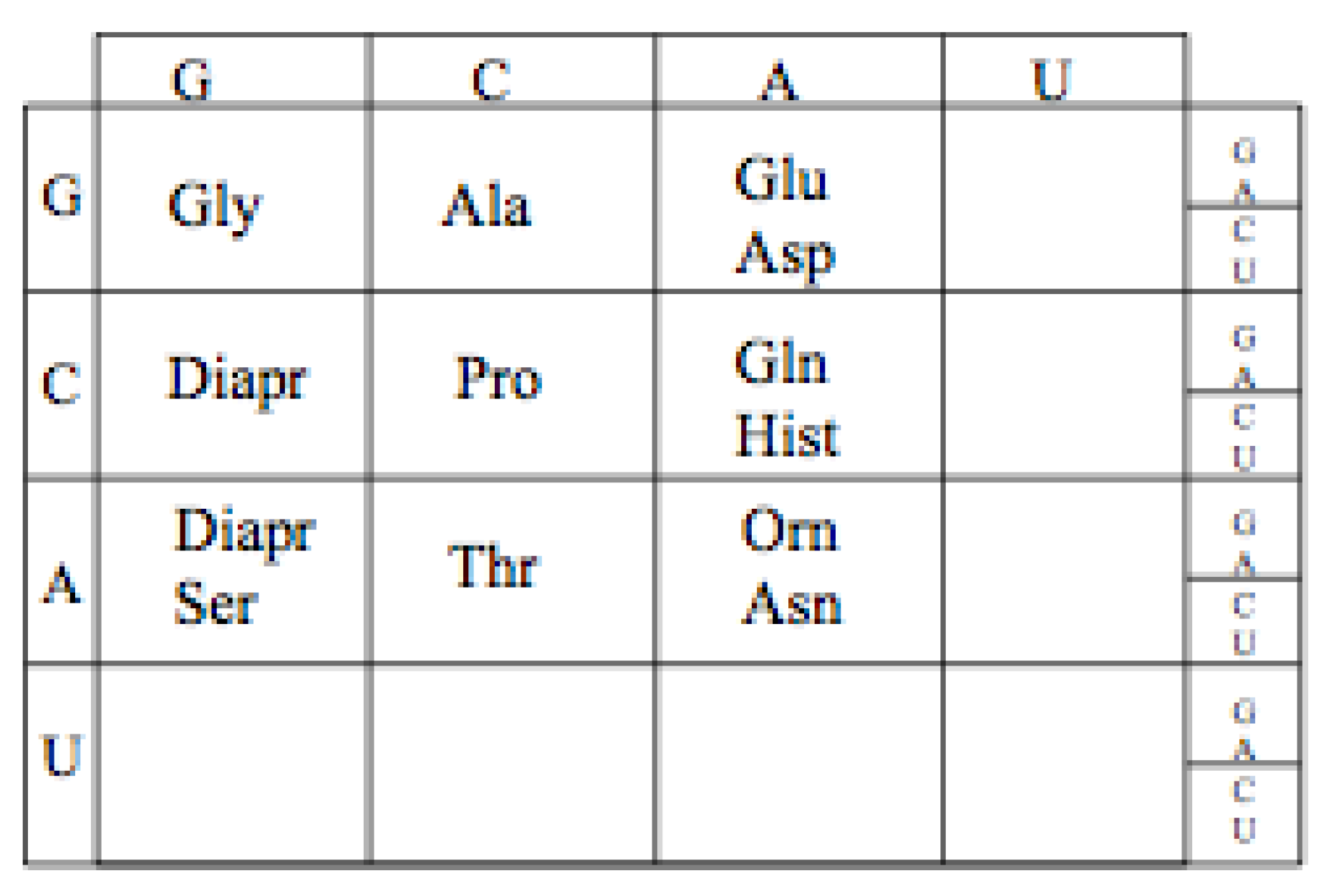 - Rodin, S.; Rodin, A.; Ohno, S. The presence of codon-anticodon pairs in the acceptor stem of tRNAs. Proc. Natl. Acad. Sci. USA 1996, 93, 4537–4542. [Google Scholar] [CrossRef]