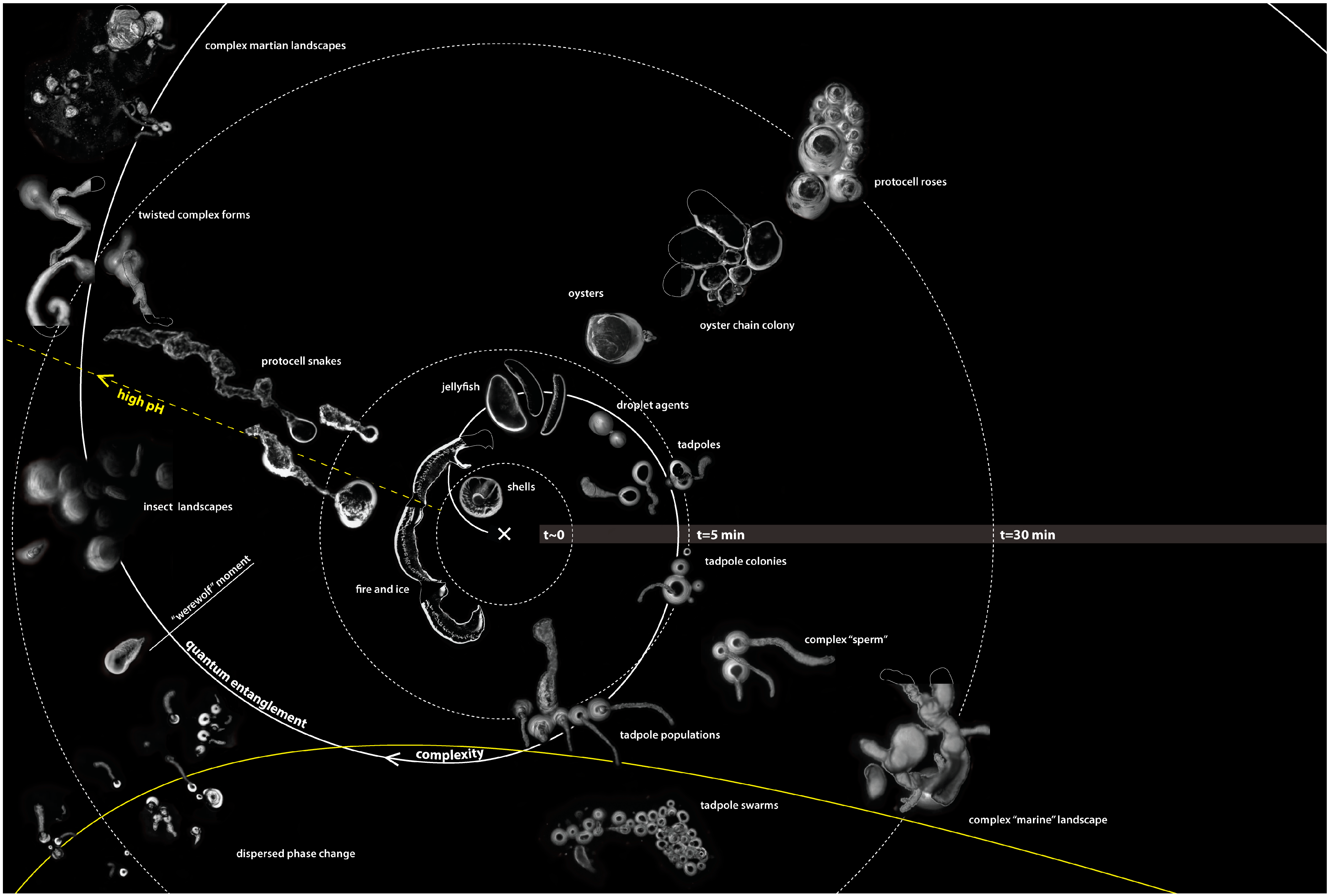 The diagram is centred at time zero, from which concentric circles radiate, representing an exponentially increasing series of time intervals. This logarithmically increasing function proposes to encapsulate the intense self-organizing activity that happens early on in the chemical reaction and falls off rapidly with the passage of time. An estimated ninety percent of chemical activity is completed within five minutes of activation of the system, although individual droplets have been observed to be active as long as an hour after their genesis. A spiral that represents complexity that also radiates from the origin and depicts the high frequency of events around the start of the reaction that becomes less frequent as time unfolds. The various morphologies and behaviours that indicate change in the system are subjectively grouped according to the authors’ experimental findings and interpretations. For example, the complex oyster chains are distinct in appearance but only differ by degree, from the complex marine landscapes. Specifically, “oysters” produce a large mass of material and their soft bodies bulge from their material shell-like tethers, which anchor them, as shown in Figure 5.