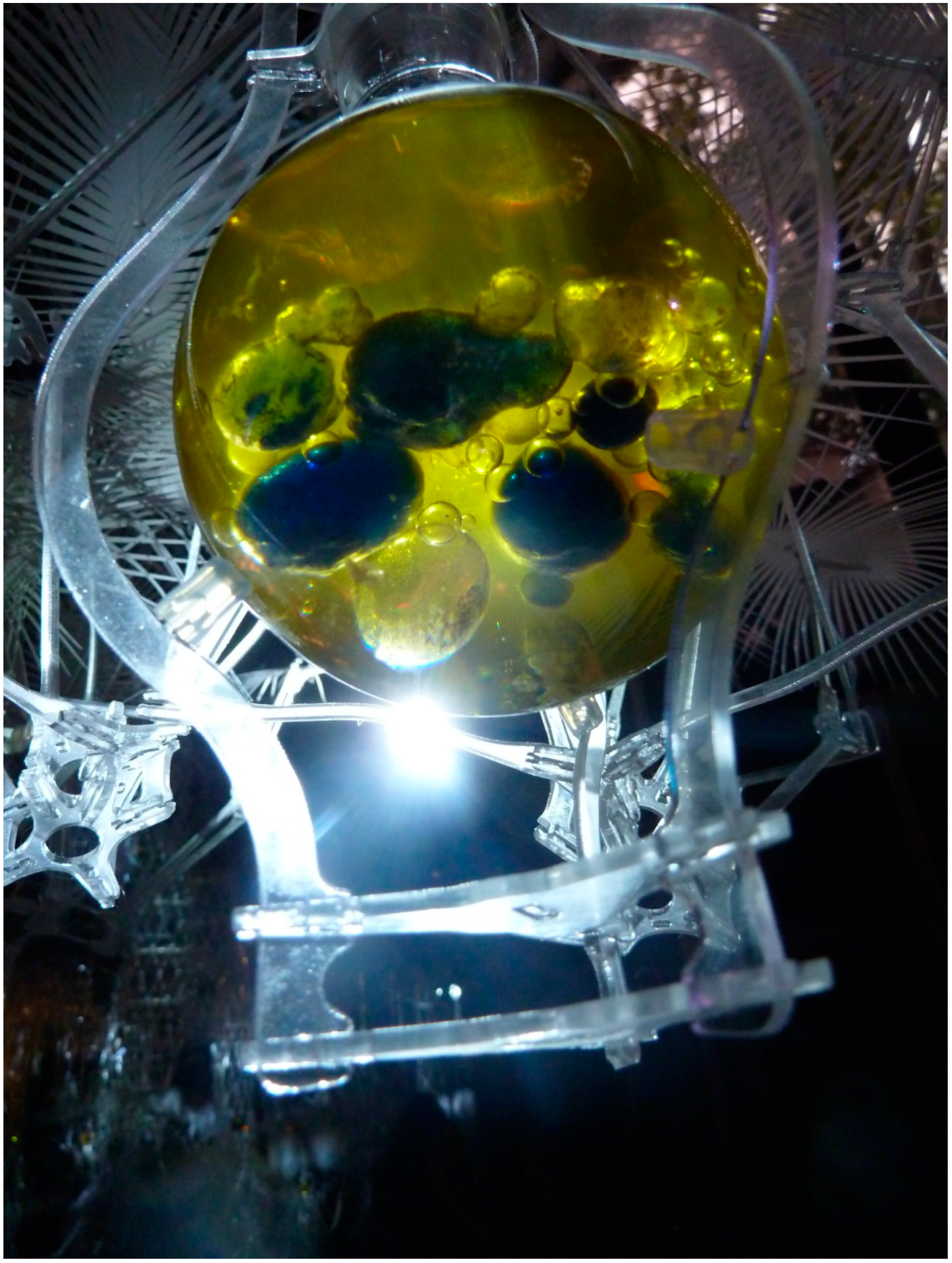 Modified Bütschli droplets respond to environmental conditions in flasks that are open to the air. Incubator Flasks were suspended in the Hylozoic Ground matrix and positioned over light emitting diodes (LEDs) to capture heat and light from the activated cybernetic matrix.