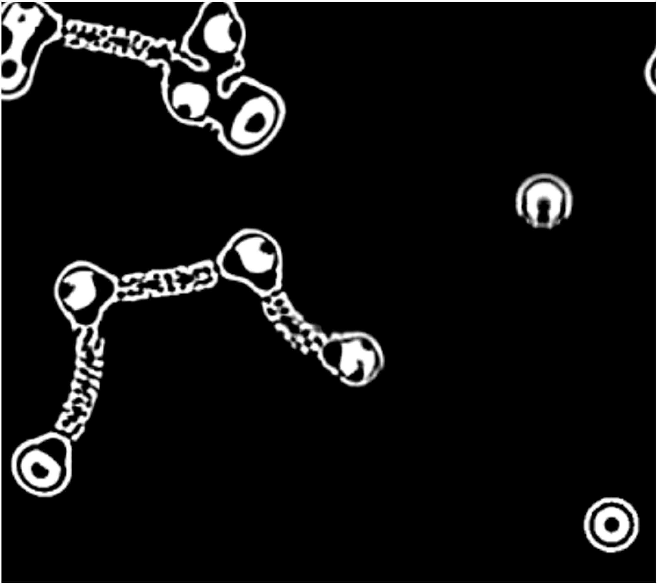 | 8 min | ![]() | 300-micron width of micrograph. Two Bütschli droplets engage active interfaces generating various, dynamic points of contact. They continue to make contact until the product (sodium oleate crystals) obstructs the interface between them. | Interfaces between droplets persistently osculate. |