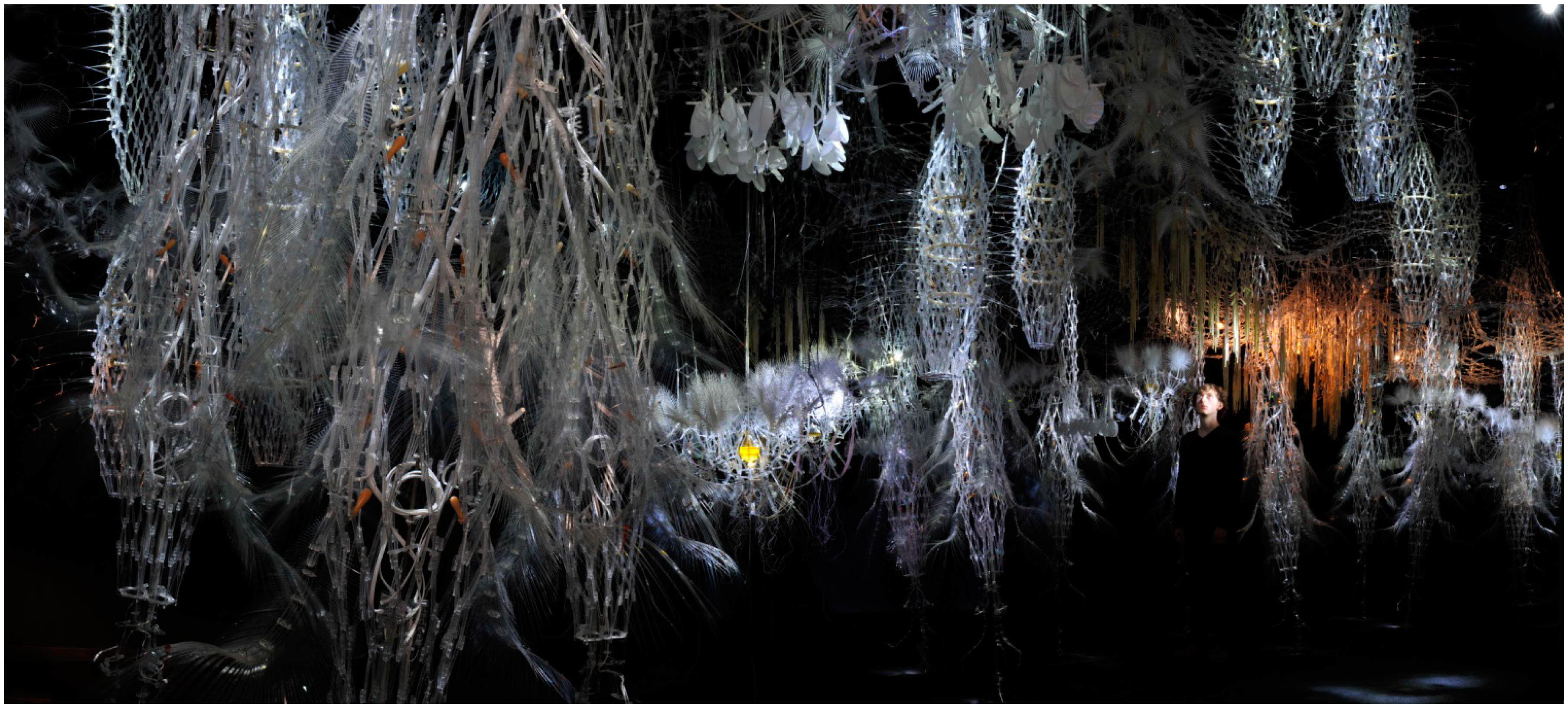 For the protocell to useable as a technical system, it must be possible to shape its operations. The protocell itself may be as a “leaky” body that is responsive to control strategies that that operate through natural computing techniques to open up new design and engineering possibilities. The designer therefore establishes the selective permeability of protocell agents and sets limits for their potential interactions. For example, internal conditions can be manipulated by adding a soluble mineral, such as Copper II Sulphate, to an attenuated droplet to produce green copper carbonate precipitate in the presence of carbon dioxide. Additionally, introducing organic solvents to the olive oil medium, such as ethanol and acetone, reduce surface tension and cause a rapid mass movement of droplets towards the source. However, for natural computing to have cultural relevance the systems must exist at a scale by which they can be observed, manipulated and inhabited. By adding an inhibitor from the products of the reaction itself, the selective permeability of the agents is greatly reduced and droplet interactions can be slowed down and their diameter increased from around a millimeter up to several centimetres in diameter. Modified Bütschli droplets can even be applied at an architectural scale in the most pragmatic sense, by converging their interactions with other systems. In the “Hylozoic Ground” cybernetic installation designed by architect Philip Beesley for the 2010 Venice Architecture Biennale, modified Bütschli droplets notionally operated as a giant “smell” or “taste” system that responded to exhaled carbon dioxide from gallery visitors that dissolved into open flasks and produced brightly coloured carbonate precipitates on contact with soluble nickel II, iron II, iron III, and cobalt II salts, see Figure 7.