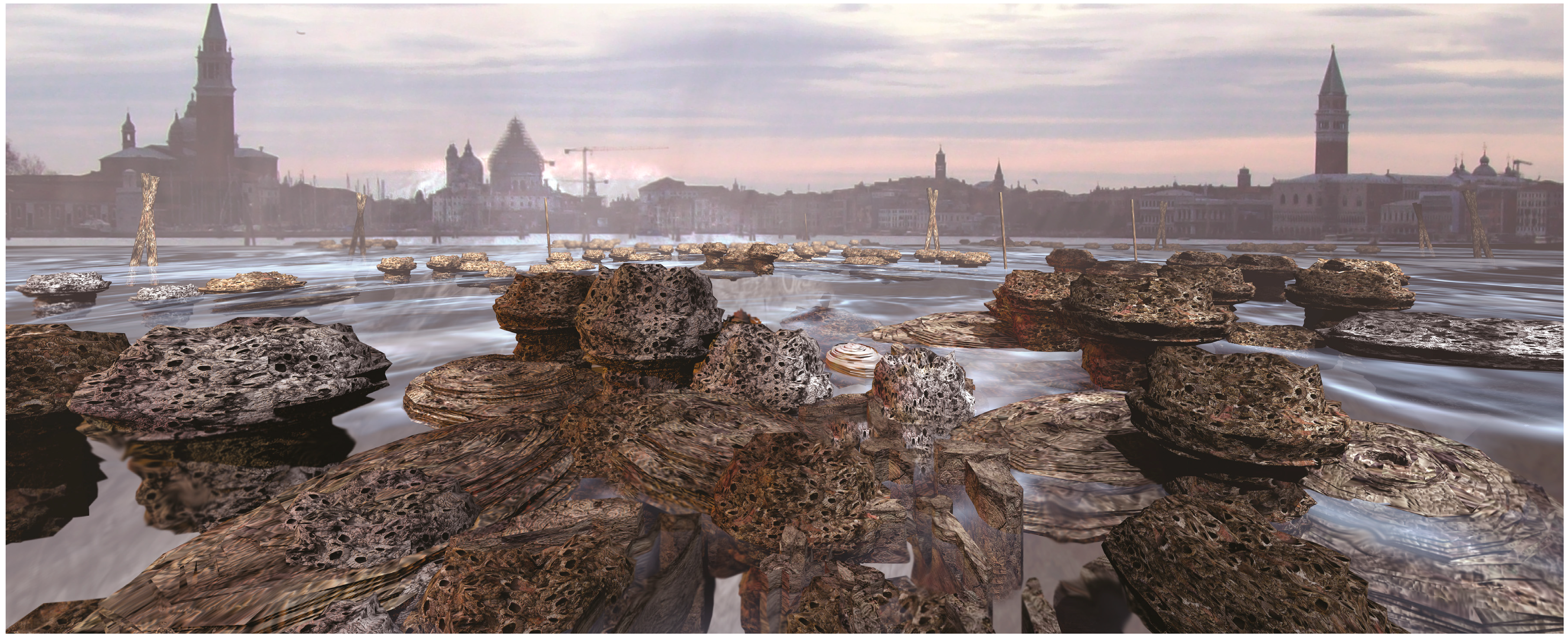Droplet assemblages, which grow the structural and physiological framework of an artificial reef under the city, may produce porous, pumice-like formations over time that reflect mineral compositions through their coloured layers, like stromatolites. The resultant architecture does not obey a top-down paradigm but is codesigned through the entangled metabolic interactions of marine and human populations.