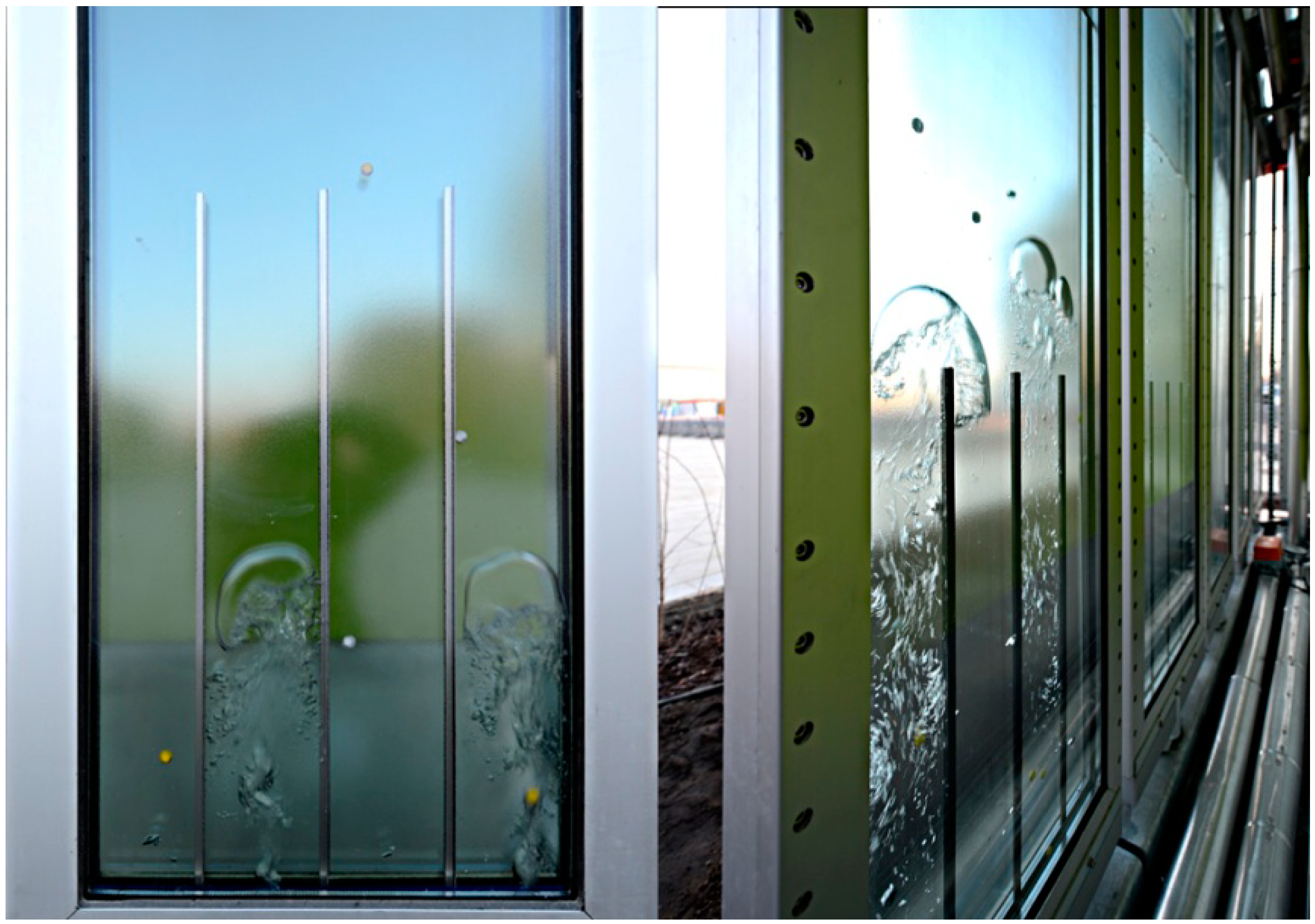 However, such notions are not entirely speculative. The construction-engineering cooperative Arup is currently evaluating facades that house algae to provide energy for buildings in a project designed for the International Building Association in Hamburg, see Figure 14. These algae facades are essentially aquariums full of microalgae that are fed by sunlight within tall, narrow glass panels through which carbon dioxide is bubbled. As they flourish, the biomass of these microorganisms is syphoned off, dried, and combusted to offset energy consumption within the building [69].
