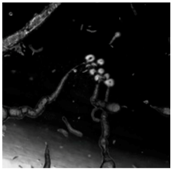 | 8 min | ![]() | 300-micron width of each micrograph Osmotic structure seen with and without fluoroscopy in which the Bütschli droplet has just detached from an osmotic structure. | These figures are of the same structure. |