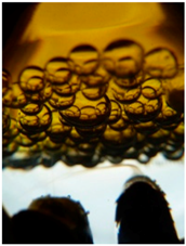 ![]() | 6 mm width of micrograph. Turbulent, shell-like droplets that appear as a series of sequentially emerging manifolds. | Some “shells” collapse while others self-organise into droplets with life-like properties such as, movement. |