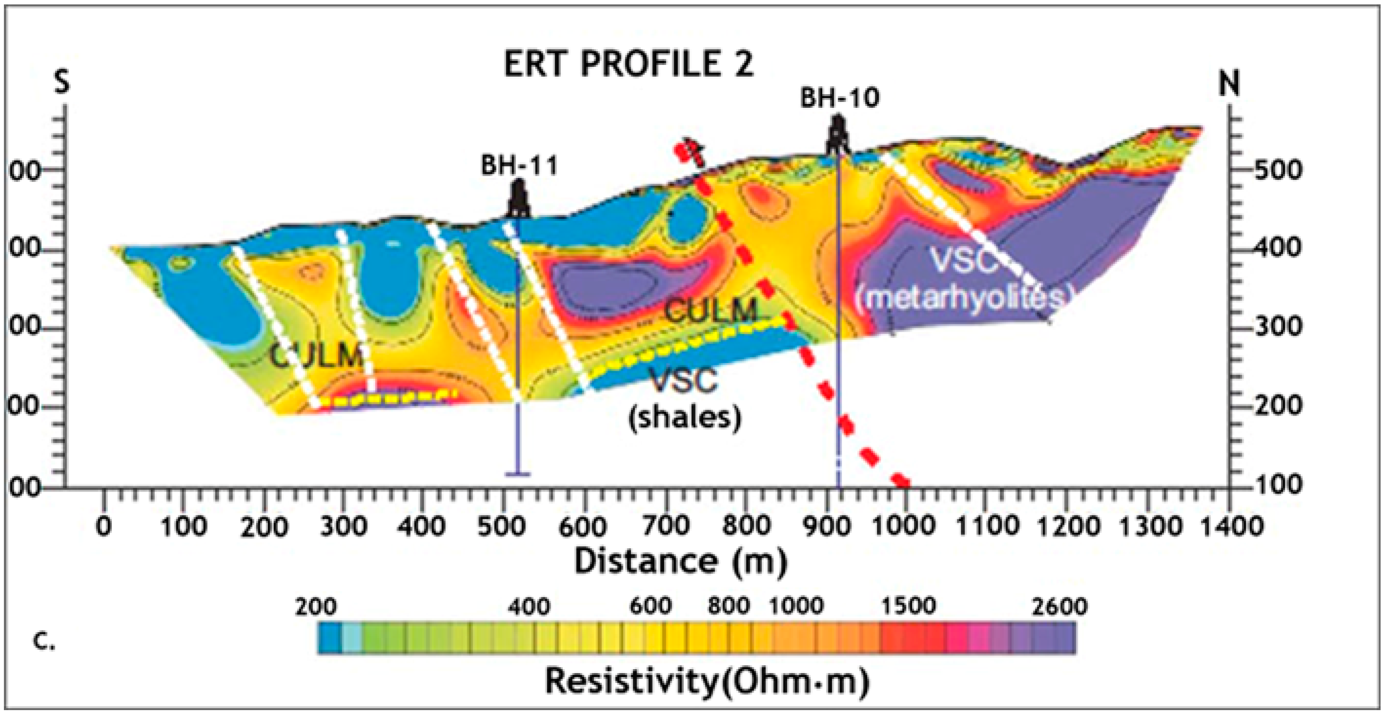 To further investigate the characteristics of the subsurface geomicrobiology of the IPB, researchers at the Centro de Astrobiología applied for an ERC project, which was granted in 2011 and which is currently being carried out (Iberian Pyrite Belt Subsurface Life Detection, IPBSL). Electric resistivity tomography (ERT) (Figure 4) and time-domain electromagnetic sounding (TDEM) were used to detect the most probable subsurface areas hosting microbial activity in deep regions of the IPB. After this geophysical information was analyzed, two wells, BH10 and BH11, with depths of 620 and 340 meters, respectively, were drilled [57].