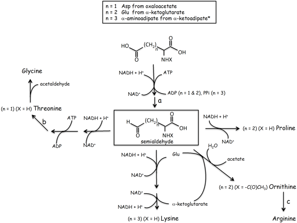 “Tricarboxylic acid cycle-semialdehyde” route for Pro, Thr, Lys and Arg synthesis. a = dephosphorylation; b = PLP-dependent dephosphorylation; c = urea cycle. The starting substrates are aminated versions of intermediates of the pathways in Figure 2.
