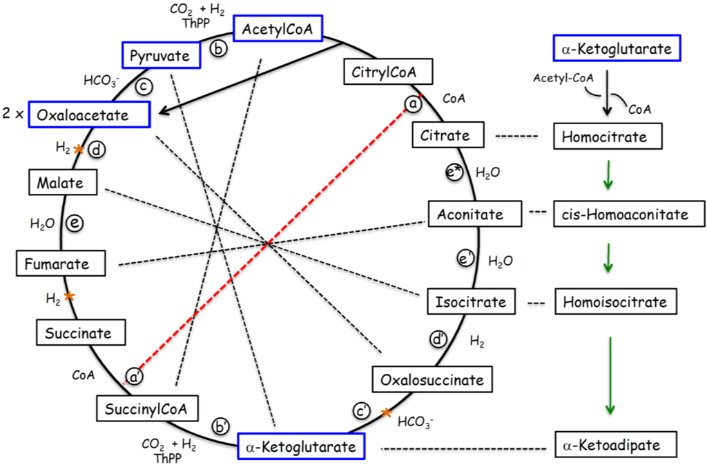 Tricarboxylic acid (TCA) cycle (blue frames depict central metabolites). In its reductive version (counterclockwise in the figure, [29]), carbon is fixed through the generation of two oxaloacetate molecules per cycle. One of these molecules is directly produced from citrylCoA (black arrow) and the other one through acetylCoA and pyruvate (circle). The TCA cycle can be divided into two halves (red dashed line) with approximately equivalent substrates (connected by black dashed lines) and reactions (indicated by a–d and a′–d′; e′ = e *). Similar substrates and reactions are also used for the synthesis of α-ketoadipate (right side of the figure; see also Figure 1) and α-ketoisocaproate (not shown,) precursors of lysine and leucine, respectively.