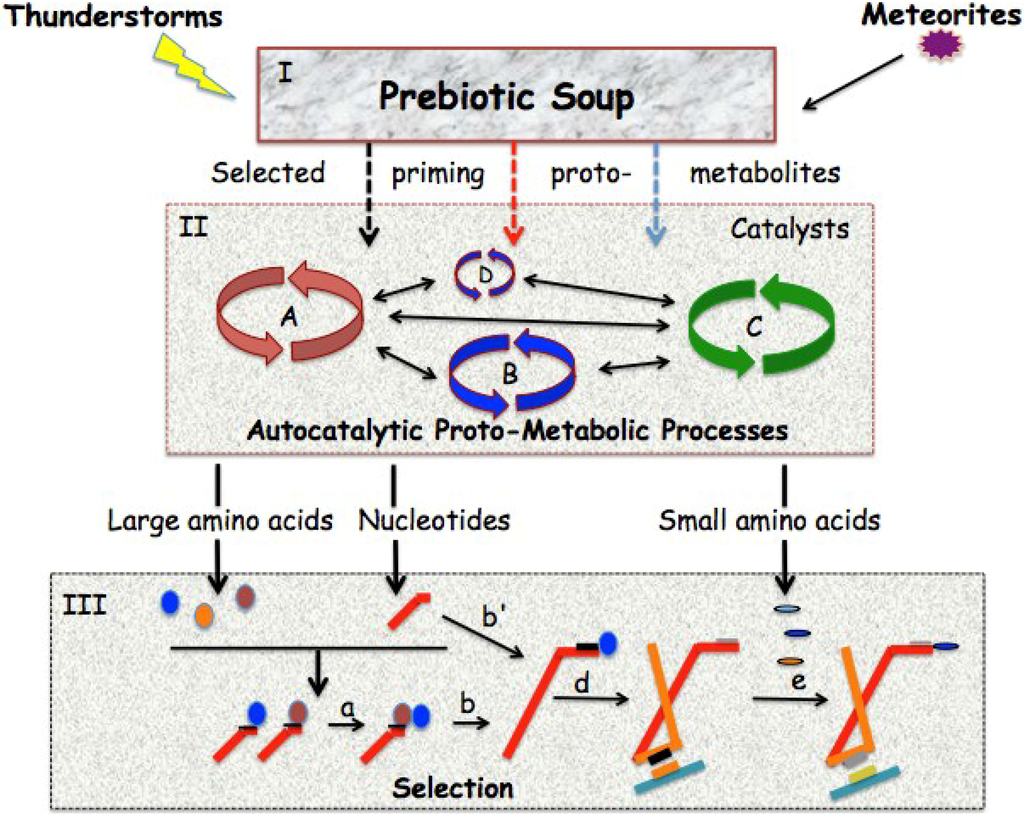 Early propositions [1], followed by the original Miller-Urey [2] and later spark-tube experiments [3,4], along with meteorite content analyses [5,6], have been interpreted as evidence for a heterotrophic origin of life. According to this idea, commonly represented by the well-known “primordial soup” concept, abiotically generated amino acids, as well as other organic molecules, either synthesized on Earth or brought in by celestial bodies, were the first building blocks of life. According to the carbon-isotopic composition of apatite inclusions from the Isua belt in Greenland the first life on Earth appeared not later than about 3800 Myr ago, approximately 700 Myr after the planet’s formation [7]. Conversely, the earliest known microfossils, dated at 3500 Myr ago, are already structurally complex [7] and belong to microorganisms that were most likely modern in most aspects including a DNA-based genetic code. Although, as we will see below, views concerning the nature of an initial genetic coding or its absence are highly variable, it is generally agreed that the extensive involvement of RNA in contemporary protein synthesis strongly suggests it played a fundamental role in the very early stages of peptide formation. Consistent with this view RNAs are thought to have appeared very early on Earth both as self-replicators and catalysts [8]. Indeed, the discovery of ribozymes (catalytic RNAs), led W. Gilbert to propose the existence of an “RNA World”, predating the emergence of DNA and proteins [9]. The most appealing aspect of this concept is the plausible unification of informational capability and catalysis in the same molecule. Furthermore, these RNAs should have been capable of undergoing Darwinian evolution catalyzing many relevant reactions in a “RNA World” scenario [10].