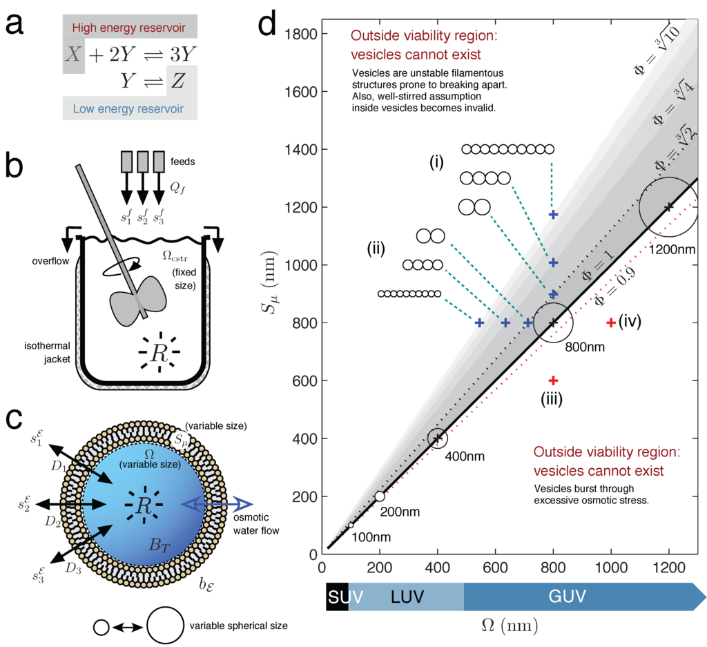 Chemical Reactor Models. (a) A chemical reaction held far-from-equilibrium by use of two constant concentration reservoirs (reservoir conditions). (b) Continuous-flow stirred tank reactor (CSTR) model with non-limiting outflow, constant solvent volume and constant reaction temperature. (c) Unilamellar lipid vesicle, with variable internal solvent volume determined by osmotic water flow equalizing the total solute concentration difference across the semi-permeable membrane. (d) Lipid vesicle morphology space, with vesicle viability space drawn as the sub-region of all possible morphologies (grayscale region). Axes express vesicle volume Ω and surface area Sµ as the nm diameter of a sphere having volume Ω or surface area Sµ, respectively. Spherical vesicles (Φ = 1) are located when Ω (in nm)= Sµ (in nm). Circles represent vesicle cross-sections, drawn to scale (8.5% of the axes’ scale). Blue crosses indicate how the morphology of a spherical d = 800 nm giant unilamellar vesicle (GUV) changes, when (i) gaining surface or (ii) losing volume. Both conditions bring the vesicle toward more filamentous or prolate states. Prolate states are depicted as strings of smaller spherical vesicles, only to give an idea of the volume and surface ratio at the {Ω, Sµ} point; the meaning is not that the vesicle has necessarily divided into identical daughters at this stage. Red crosses indicate that the spherical d = 800 nm vesicle will burst by (iii) losing too much surface or, conversely, (iv) gaining too much volume.