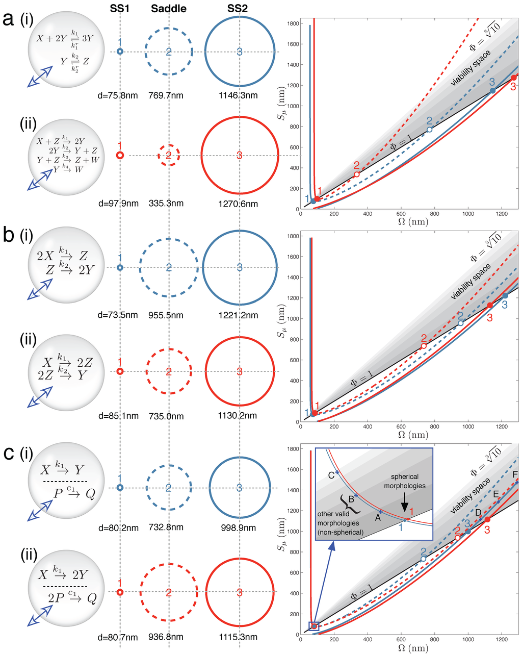 In contrast, the following two case studies provide counterexamples that support the opposite scenario, in which interesting emergent chemistry may develop as a consequence of the volume-changing aqueous interior of a vesicle. Figure 2 displays the main results for Case Studies 1–3. It demonstrates that under the correct parameter regimes, each of the two reaction schemes discussed in each case study can show bistability within the full vesicle model. Vesicle morphology space and bifurcation curves are drawn for each reaction scheme. Even the Schlögl and Wilhelm reaction systems of the present case study can exhibit bistability for some parameters (Figure 2a(i) and 2a(ii), respectively). Figure 3 accompanies Figure 2, to make clear the concentration values of all internal solutes at stable steady states SS1 and SS2 for each of the six schemes.